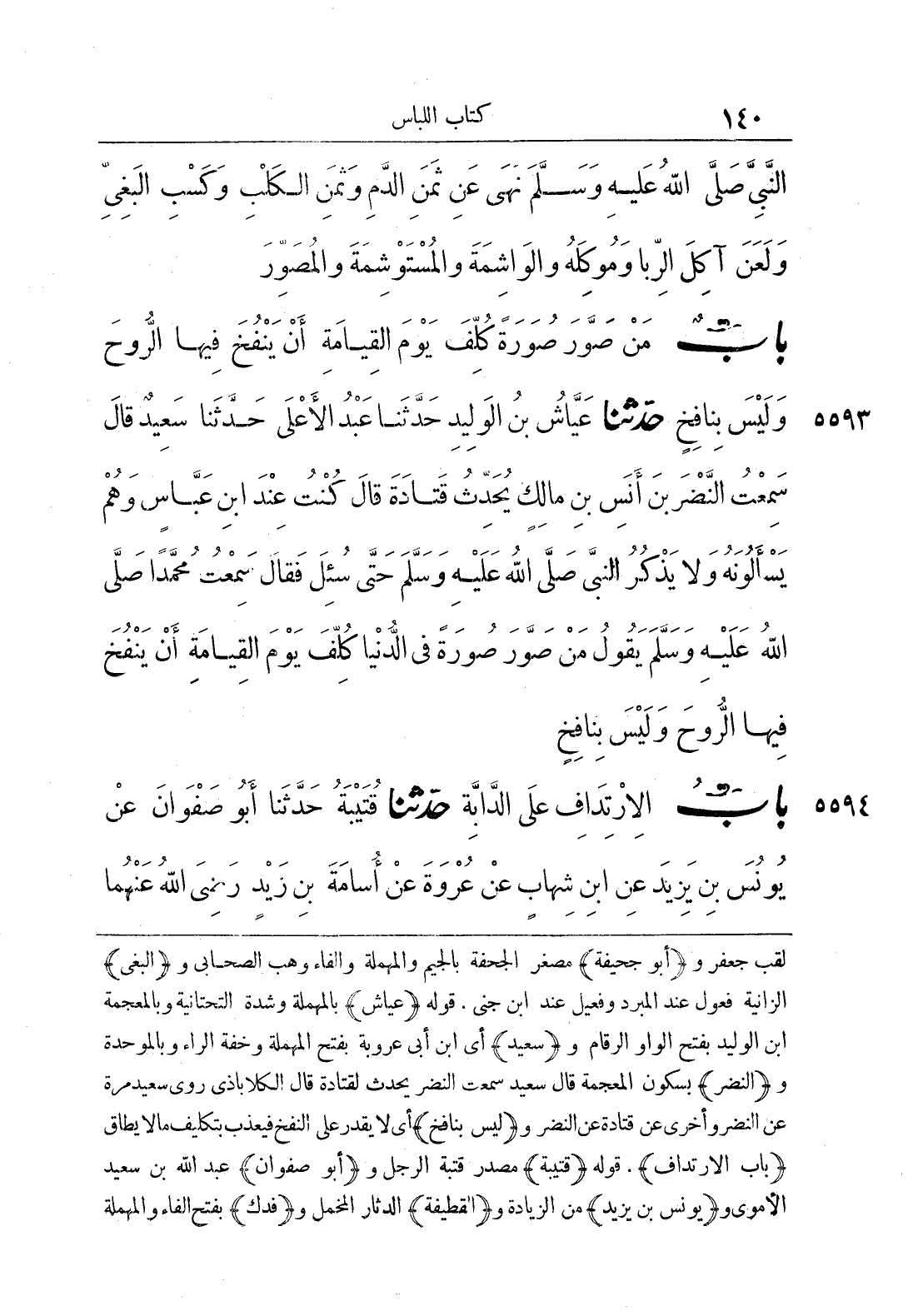 لقب جعفر و {أبو جحيفة} مصغر الجحفة بالجيم والمهملة والفاء وهب الصحابي و {البغي} الزانية فعول عند المبرد وفعيل عند ابن جني. {باب من صور صورة} قوله {عياش} بالمهملة وشدة التحتانية وبالمعجمة ابن الوليد بفتح الواو الرقام و {سعيد} أي ابن أبي عروبة بفتح المهملة وخفة الراء وبالموحدة و {النضر} بسكون المعجمة قال سعيد سمعت النضر يحدث لقتادة قال الكلاباذي روى سعيد مرة عن النضر وأخرى عن قتادة عن النضر و {ليس بنافخ} أي لا يقدر على النفخ فيعذب بتكليف مالا يطاق. {باب الإرتداف} قوله {قتيبة} مصدر قتبة الرجل و {أبو صفوان} عبد الله بن سعيد الأموي و {يونس بن يزيد} من الزيادة و {القطيفة} الدثار المخمل و {فدك} بفتح الفاء والمهملة