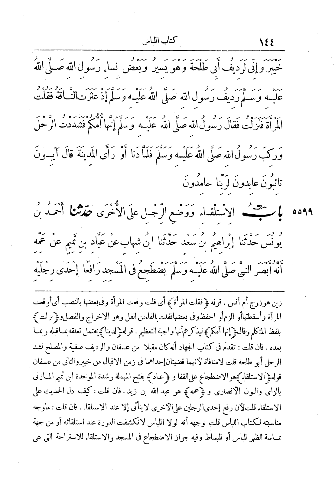زين هو زوج أم أنس. قوله {فقلت المرأة} أي قلت وقعت المرأة وفي بعضها بالنصب أي أوقعت المرأة وأسقطتها أو ألزم أو أحفظ وفي بعضها فقلت بالفاء من الفل وهو الإخراج والفصل و {نزلت} بلفظ المتكلم وقال {إنها أمكم} ليذكرهم أنها واجبة التعظيم. قوله {لدينا} يحتمل تعلقه بما قبله وبما بعده. فإن قلت: تقدم في كتاب الجهاد أنه كان مقبلا من عسفان والرديف صفية والمصلح لشد الرحل أبو طلحة قلت لا منافاة لأنهما قضيتان إحداهما في زمن الإقبال من خيبر والثاني من عسفان. قوله {الاستلقاء} هو الاضطجاع على القفا و {عباد} بفتح المهملة وشدة الموحدة ابن تميم المازني بالزاي والنون الأنصاري و {عمه} هو عبد الله بن زيد. فإن قلت: كيف دل الحديث على الاستلقاء قلت لأن رفع إحدى الرجلين على الأخرى لا يتأتى إلا عند الاستلقاء. فإن قلت: ما وجه مناسبته لكتاب اللباس قلت وجهه أنه لولا اللباس لانكشفت العورة عند استلقائه أو من جهة مماسة الظهر للباس أو للبساط وفيه جواز الاضطجاع في المسجد والاستلقاء للاستراحة التي هي
