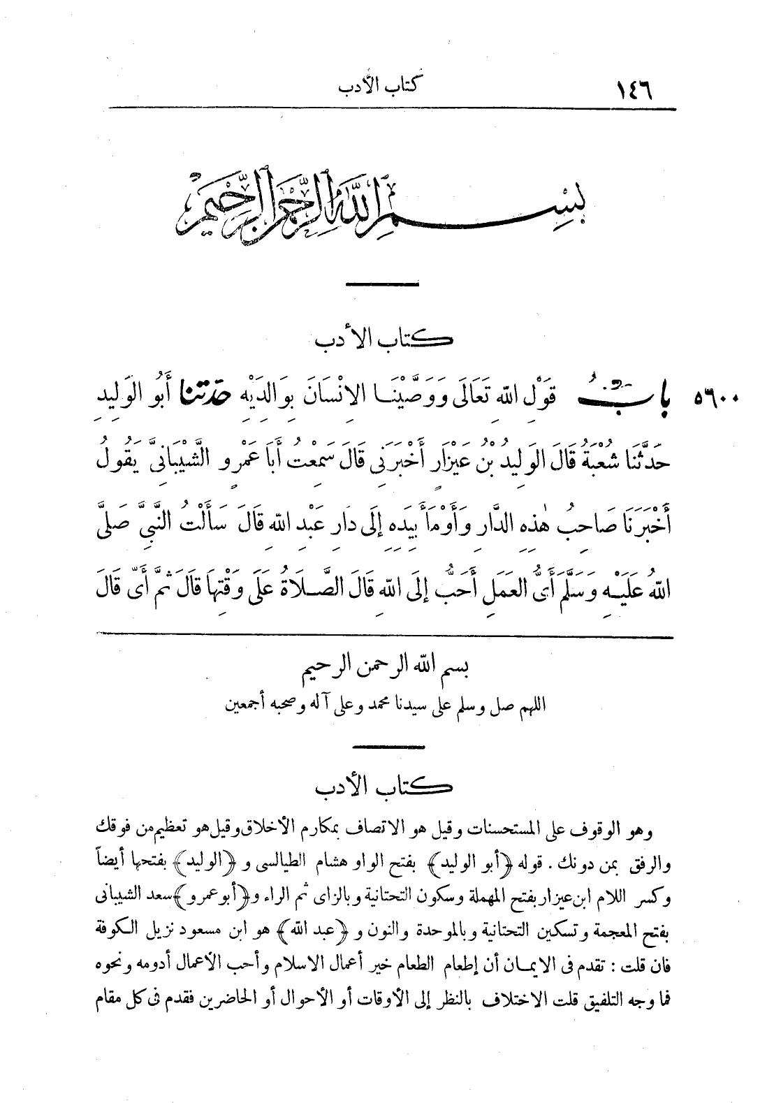 وهو الوقوف على المستحسنات وقيل هو الاتصاف بمكارم الأخلاق وقيل هو تعظيم من فوقك والرفق بمن دونك، {باب قوله تعالى ووصينا الإنسان بوالديه} قوله {أبو الوليد} بفتح الواو هشام الطيالسي و {الوليد} بفتحها أيضا وكسر اللام ابن عيزار بفتح المهملة وسكون التحتانية وبالزاي ثم الراء و {أبو عمرو} سعد الشيباني بفتح المعجمة وتسكين التحتانية وبالموحدة والنون و {عبد الله} هو ابن مسعود نزيل الكوفة فإن قلت: تقدم في الإيمان أن إطعام الطعام خير أعمال الإسلام وأحب الأعمال أدومه ونحوه فما وجه التلفيق قلت الاختلاف بالنظر إلى الأوقات أو الأحوال أو الحاضرين فقدم في كل مقام