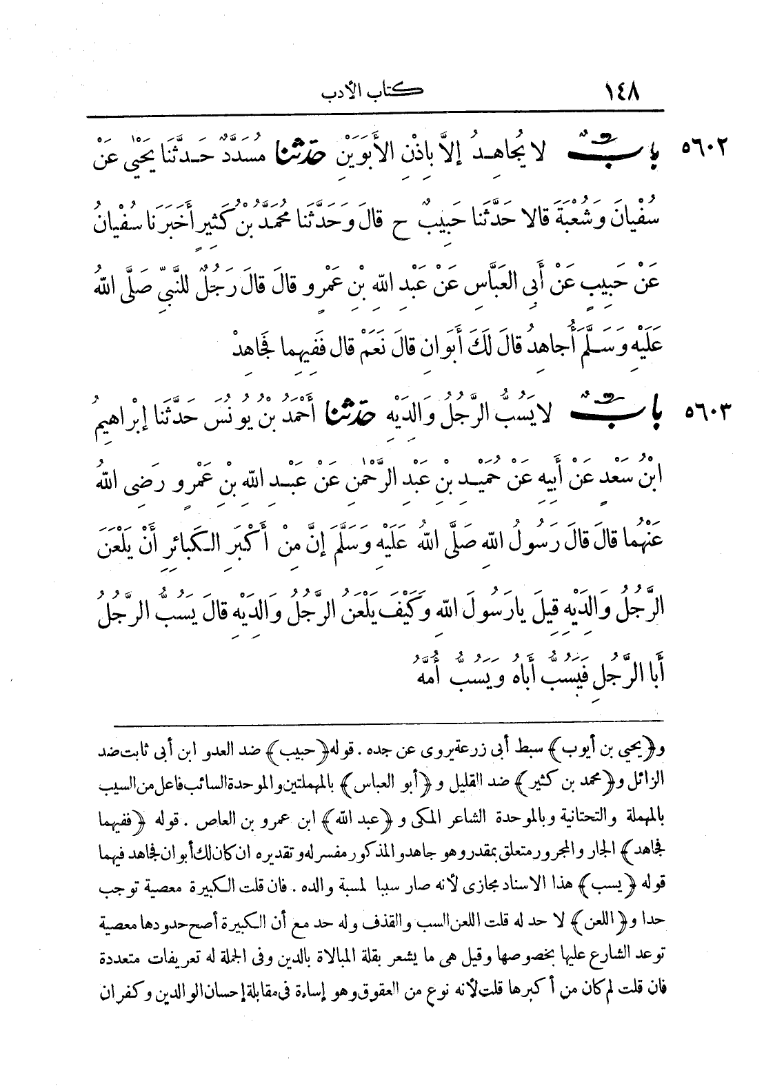 و {يحيى بن أيوب} سبط أبي زرعة يروي عن جده. {باب لا يجاهد إلا بإذن الأبوين} قوله {حبيب} ضد العدو ابن أبي ثابت ضد الزائل و {محمد بن كثير} ضد القليل و {أبو العباس} بالمهملتين الموحدة السائب فاعل من السيب بالمهملة والتحتانية وبالموحدة الشاعر المكي و {عبد الله} ابن عمرو بن العاص، قوله {ففيهما فجاهد} الجار والمجرور متعلق بمقدر وهو جاهد والمذكور مفسر له وتقديره إن كان لك أبوان فجاهد فيهما، {باب لا يسب الرجل والديه} قوله {يسب} هذا الإسناد مجازي لأنه صار سببا لمسبة والده. فإن قلت الكبيرة معصية توجب حدا و {اللعن} لا حد له قلت السب والقذف وله حد مع أن الكبيرة أصح حدودها معصية توعد الشارع عليها بخصوصها وقيل هي ما يشعر بقلة المبالاة بالدين وفي الجملة تعريفات متعددة فإن قلت لم كان من أكبرها قلت لأنه نوع من العقوق وهو إساءة في مقابلة إحسان الوالدين وكفران