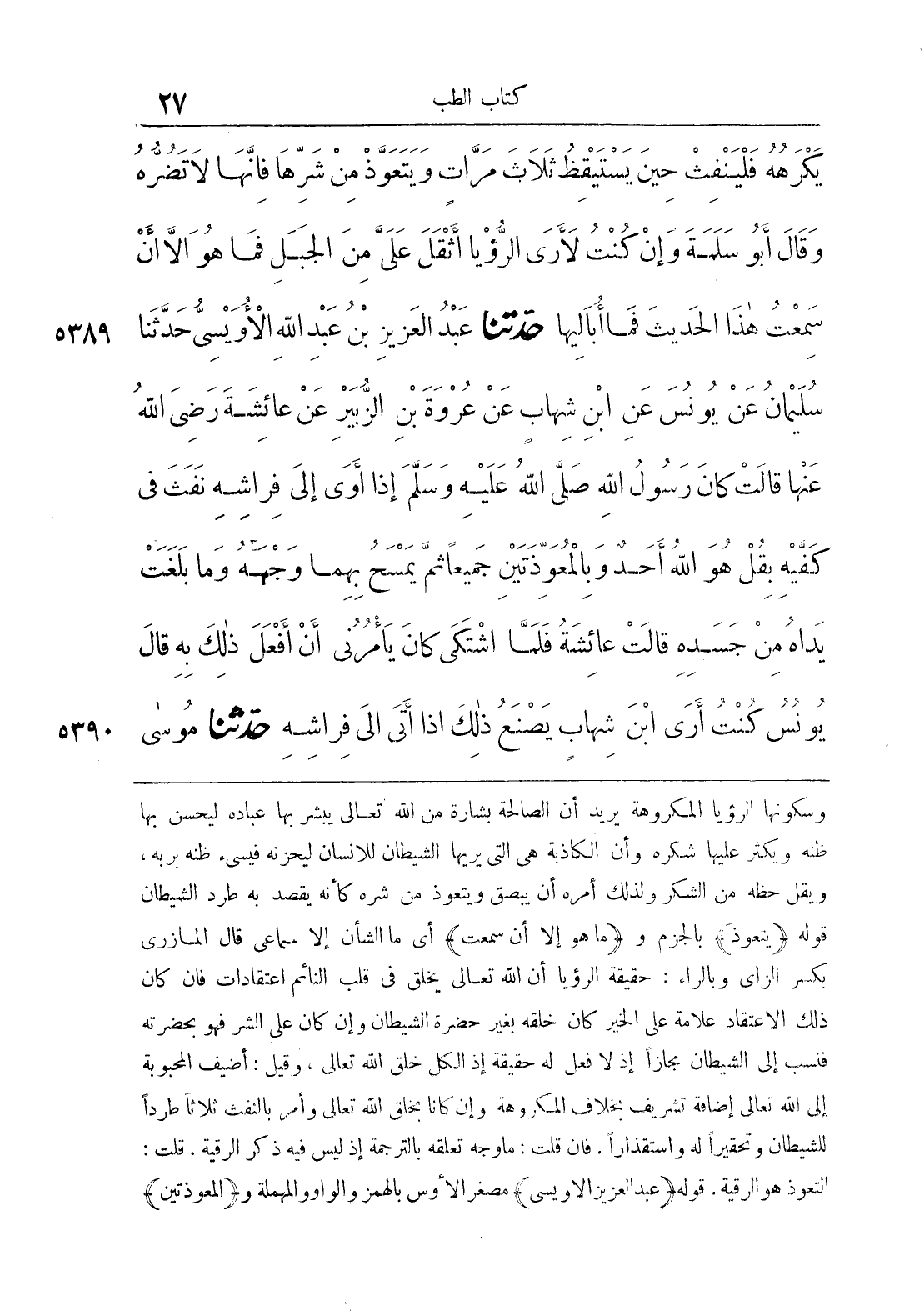 5389 - حَدَّثَنَا عَبْدُ الْعَزِيزِ بْنُ عَبْدِ اللَّهِ الْأُوَيْسِيُّ حَدَّثَنَا سُلَيْمَانُ عَنْ يُونُسَ عَنْ ابْنِ شِهَابٍ عَنْ عُرْوَةَ بْنِ الزُّبَيْرِ عَنْ عَائِشَةَ رَضِيَ اللَّهُ عَنْهَا قَالَتْ كَانَ رَسُولُ اللَّهِ صَلَّى اللَّهُ عَلَيْهِ وَسَلَّمَ إِذَا أَوَى إِلَى فِرَاشِهِ نَفَثَ فِي كَفَّيْهِ بِقُلْ هُوَ اللَّهُ أَحَدٌ وَبِالْمُعَوِّذَتَيْنِ جَمِيعًا ثُمَّ يَمْسَحُ بِهِمَا وَجْهَهُ وَمَا بَلَغَتْ يَدَاهُ مِنْ جَسَدِهِ قَالَتْ عَائِشَةُ فَلَمَّا اشْتَكَى كَانَ يَامُرُنِي أَنْ أَفْعَلَ ذَلِكَ بِهِ قَالَ يُونُسُ كُنْتُ أَرَى ابْنَ شِهَابٍ يَصْنَعُ ذَلِكَ إِذَا أَتَى إِلَى فِرَاشِهِ