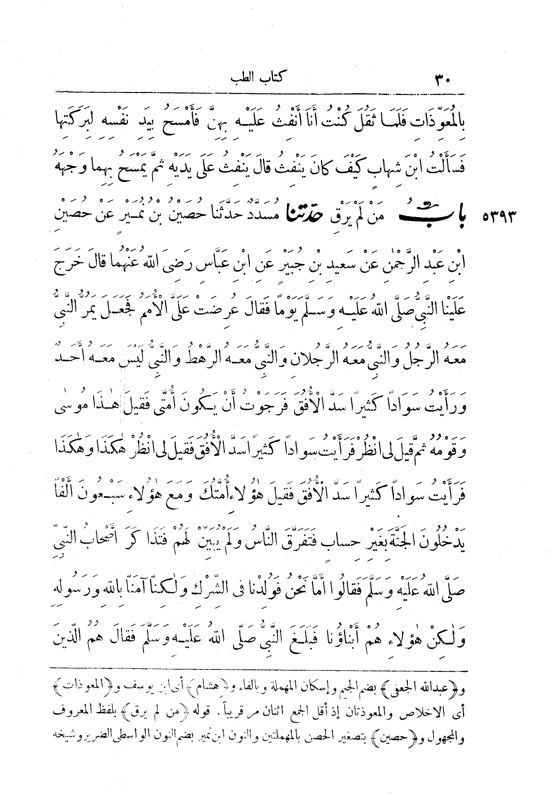 و {عبد الله الجعفي} بضم الجيم وإسكان المهملة وبالفاء و {هشام} أي ابن يوسف و {المعوذات} أي الإخلاص والمعوذتان إذ أقل الجمع اثنان مر قريبا. {باب من لم يرق} قوله {من لم يرق} بلفظ المعروف والمجهول و {حصين} بتصغير الحصن بالمهملتين والنون ابن نمير بضم النون الواسطي الضرير وشيخه