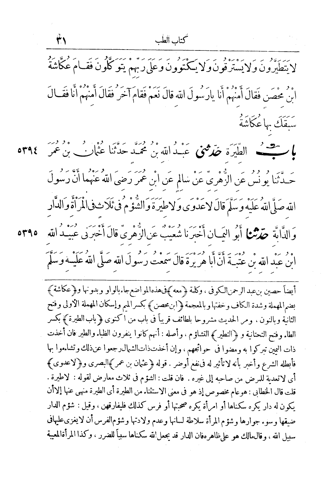أيضا حصين بن عبد الرحمن الكوفي، وكلمة {معه} في هذه المواضع جاء بالواو وبدونها و {عكاشة} بضم المهملة وشدة الكاف وخفتها وبالمعجمة {ابن محصن} بكسر الميم وإسكان المهملة الأولى وفتح الثانية وبالنون، ومر الحديث مشروحا بلطائف قريبا في باب من اكتوى. {باب الطيرة والفأل} بكسر الطاء وفتح التحتانية و {التطير} التشاؤم، وأصله: أنهم كانوا ينفرون الظباء والطير فإن أخذت ذات اليمين تبركوا به ومضوا في حوائجهم، وإن أخذت ذات الشمال رجعوا عن ذلك وتشاءموا بها فأبطله الشرع وأخبر بأنه لا تأثير له في نفع أو ضر، قوله {عثمان بن عمر} البصري و {لا عدوى} أي لا تعدية للمرض من صاحبه إلى غيره، فإن قلت: الشؤم في ثلاث معارض لقوله: لا طيرة. قلت قال الخطابي: هو عام مخصوص إذ هو في معنى الاستثناء من الطيرة أي الطيرة منهي عنها إلا أن يكون له دار يكره سكناها أو امرأة يكره صحبتها أو فرس كذلك فليفارقهن، وقيل شؤم الدار ضيقها وسوء جوارها شؤم المرأة سلاطة لسانها وعدم ولادتها وشؤم الفرس أن لا يغزى عليها في سبيل الله، وقال مالك هو على ظاهره فإن الدار قد يجعل الله سكناها سببا للضرر، وكذا المرأة المعيبة