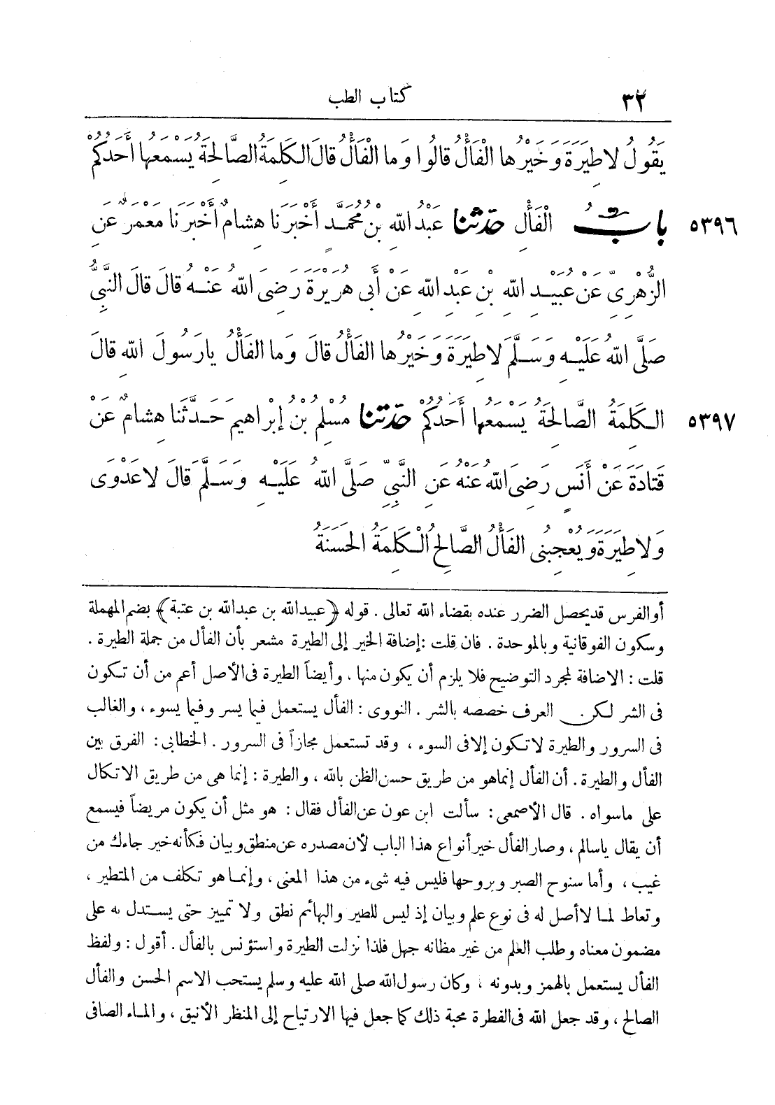 5396 - حَدَّثَنَا عَبْدُ اللَّهِ بْنُ مُحَمَّدٍ أَخْبَرَنَا هِشَامٌ أَخْبَرَنَا مَعْمَرٌ عَنْ الزُّهْرِيِّ عَنْ عُبَيْدِ اللَّهِ بْنِ عَبْدِ اللَّهِ عَنْ أَبِي هُرَيْرَةَ رَضِيَ اللَّهُ عَنْهُ قَالَ قَالَ النَّبِيُّ صَلَّى اللَّهُ عَلَيْهِ وَسَلَّمَ لَا طِيَرَةَ وَخَيْرُهَا الْفَالُ قَالَ وَمَا الْفَالُ يَا رَسُولَ اللَّهِ قَالَ الْكَلِمَةُ الصَّالِحَةُ يَسْمَعُهَا أَحَدُكُمْ