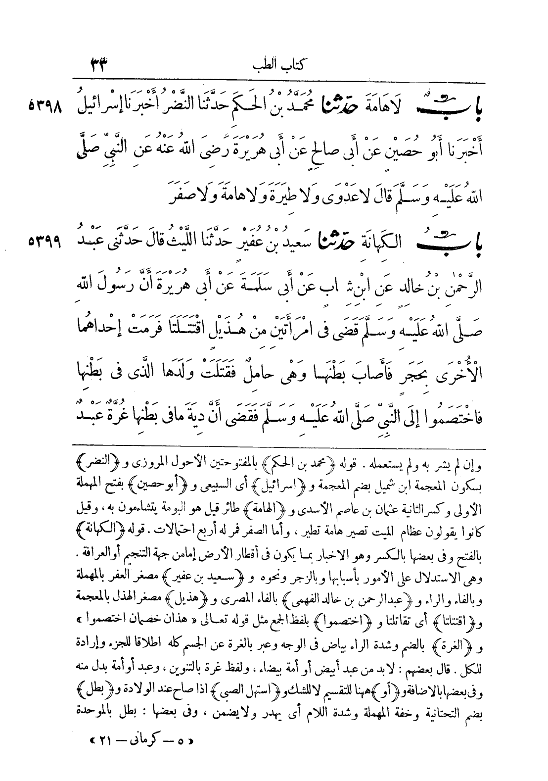 وإن لم يشر به ولم يستعمله، {باب لا هامة} قوله {محمد بن الحكم} بالمفتوحتين الأحول المروزي و {النضر} بسكون المعجمة ابن شميل و {إسرائيل} أي السبيعي و {أبو حصين} بفتح المهملة الأولى وكسر الثانية عثمان بن عاصم الأسدي و {الهامة} طائر قيل هو البومة يتشاءمون به، وقيل كانوا يقولون عظام الميت تصير هامة تطير، وأما الصفر فمر له أربع احتمالات، {باب الكهانة} قوله {الكهانة} بالفتح وفي بعضها بالكسر وهو الإخبار بما يكون في أقطار الأرض إما من جهة التنجيم أو العرافة. وهي الاستدلال على الأمور بأسبابها وبالزجر ونحوه و {سعيد بن عفير} مصغر العفر بالمهملة وبالفاء والراء و {عبد الرحمن بن خالد الفهمي} بالفاء المصري و {هذيل} مصغر الهذل بالمعجمة و {اقتتلنا} أي تقاتلنا و {اختصموا} بلفظ الجمع مثل قوله تعالى"هذان خصمان اختصموا" و {الغرة} بالضم وشدة الراء بياض في الوجه وعبر بالغرة عن الجسم كله إطلاقا للجزء وإرادة للكل. قال بعضهم: لابد من عبد أبيض أو أمة بيضاء، لفظ غرة بالتنوين وعبد أو أمة بدل منه وفي بعضها بالإضافة و {أو} هاهنا للتقسيم لا للشك و {استهل الصبي} إذ صاح عند الولادة و {بطل} بضم التحتانية وشدة اللام أي يهدر ولا يضمن، وفي بعضها: بطل بالموحدة