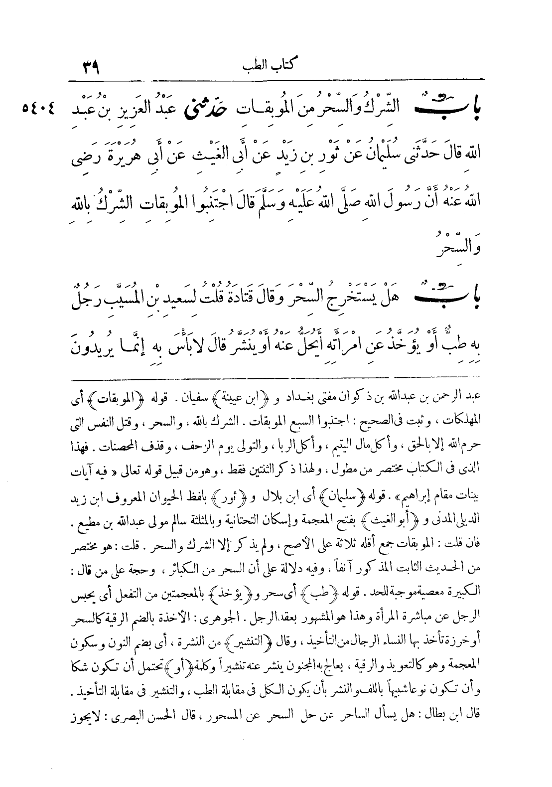 عبد الرحمن بن عبد الله بن ذكوان مفتي بغداد و {ابن عيينة} سفيان، {باب الشرك والسحر والموبقات} قوله {الموبقات} أي المهلكات، وثبت في الصحيح: اجتنبوا السبع الموبقات، الشرك بالله، السحر، وقتل النفس التي حرم الله إلا بالحق، وأكل مال اليتيم، وأكل الربا، والتولي يوم الزحف وقذف المحصنات. فهذا الذي في الكتاب مختصر من مطول، ولهذا ذكر اثنتين فقط، هو من قبيل قوله تعالى " فيه آيات بينات مقام إبراهيم "، قوله {سليمان} أي ابن بلال و {ثور} بلفظ الحيوان المعروف ابن زيد الديلي المدني و {أبو الغيث} بفتح المعجمة وإسكان التحتانية وبالمثلثة سالم مولى عبد الله بن مطيع. فإن قلت: الموبقات جمع أقله ثلاثة على الأصح، ولم يذكر إلا الشرك والسحر. قلت هو مختصر من الحديث الثابت المذكور آنفا، فيه دلالة على أن السحر من الكبائر، وحجة على من قال، الكبيرة معصية موجبة للحد. {باب هل يستخرج السحر} قوله {طب} أي سحر و {يؤخذ} بالمعجمتين من التفعل أي يحبس الرجل عن مباشرة المرأة وهذا هو المشهور بعقد الرجل. الجوهري: الأخذة بالضم الرقية كالسحر أو خرزة تأخذ بها النساء الرجال من التّأخيذ، وقال {التنشير} من النشرة، أي بضم النون وسكون المعجمة وهو كالتعويذ والرقية، يعالج به المجنون ينشر عنه تنشيرا وكلمة {أو} تحتمل أن تكون شكا وأن تكون نوعا شبيها باللف والنشر بأن يكون الكل في مقابلة الطب، والتنشير في مقابلة التأخيذ، قال ابن بطال: هل يسأل الساحر عن حل السحر عن المسحور، قال الحسن البصري: لا يجوز