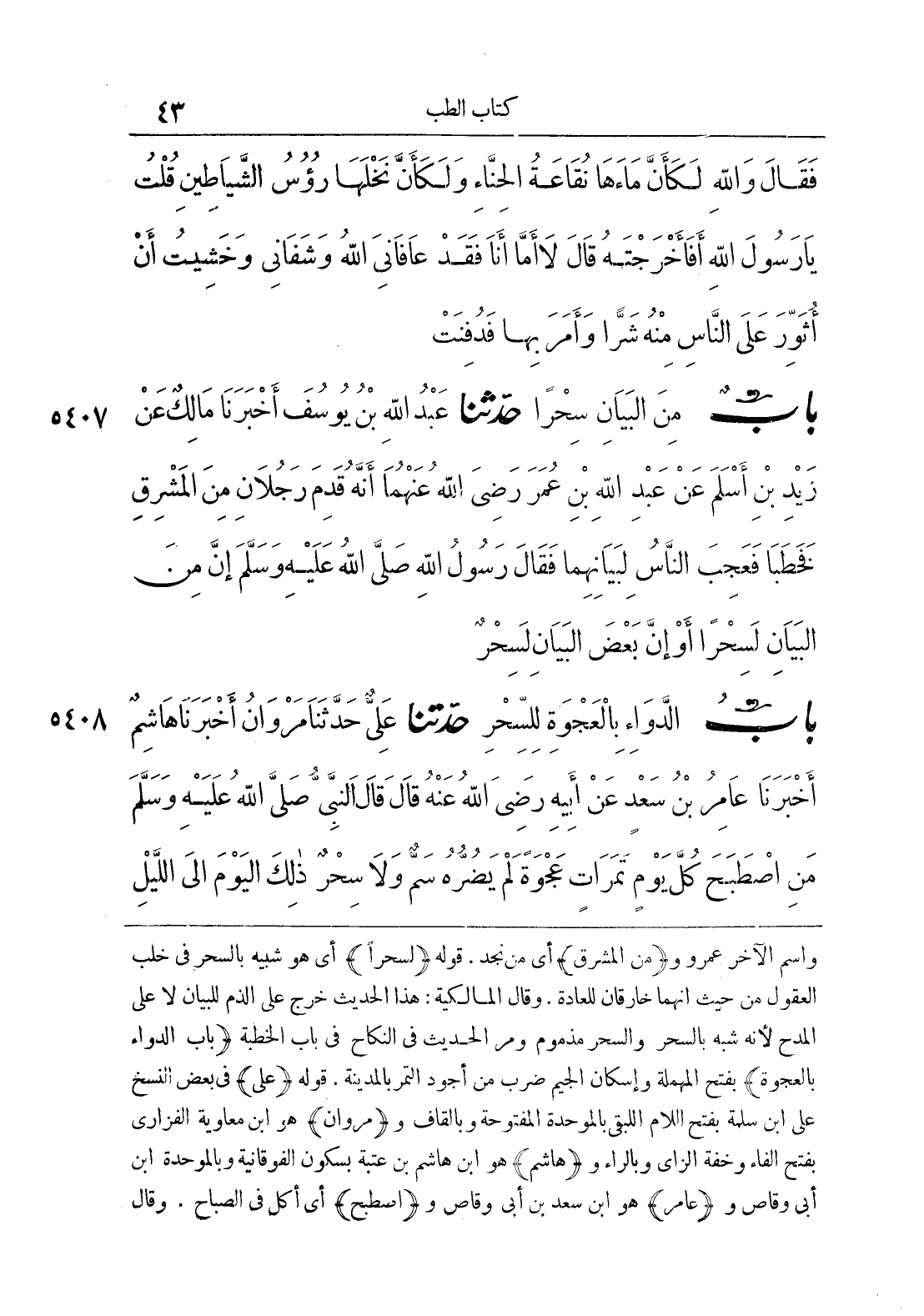5408 - حَدَّثَنَا عَلِيٌّ حَدَّثَنَا مَرْوَانُ أَخْبَرَنَا هَاشِمٌ أَخْبَرَنَا عَامِرُ بْنُ سَعْدٍ عَنْ أَبِيهِ رَضِيَ اللَّهُ عَنْهُ قَالَ قَالَ النَّبِيُّ صَلَّى اللَّهُ عَلَيْهِ وَسَلَّمَ مَنْ اصْطَبَحَ كُلَّ يَوْمٍ تَمَرَاتٍ عَجْوَةً لَمْ يَضُرَّهُ سُمٌّ وَلَا سِحْرٌ ذَلِكَ الْيَوْمَ إِلَى اللَّيْلِ