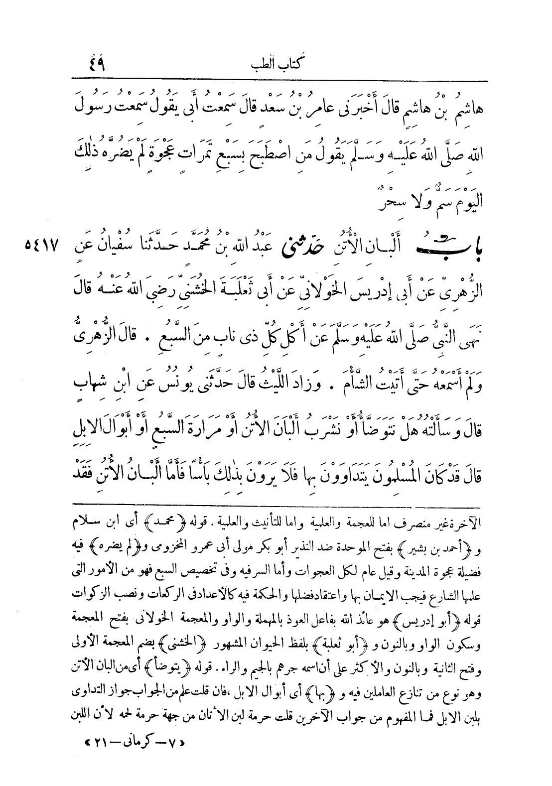 الآخرة غير منصرف إما للعجمة والعلمية وإنا للتأنيث والعلمية. قوله {محمد} أي ابن سلام و {أحمد بن بشير} بفتح الموحدة ضد النذير أبو بكر مولى أبي عمرو المخزومي و {لم يضره} فيه فضيلة عجوة المدينة وقيل عام لكل العجوات وأما السر فيه وفي تخصيص السبع فهو من الأمور التي علمها الشارع فيجب الإيمان بها واعتقاد فصلها الحكمة فيه كالاعداد في الركعات ونصب الزكوات. {باب ألبان الأتن} قوله {أبو إدريس} هو عائذ الله بفاعل العوذ بالمهملة والواو والمعجمة الخولاني بفتح المعجمة وسكون الواو وبالنون و {أبو ثعلبة} بلفظ الحيوان المشهور {الخشني} بضم المعجمة الأولى وفتح الثانية وبالنون والأكثر على أن اسمه جرهم بالجيم والراء. قوله {يتوضأ} اي من ألبان الأتن وهو نوع من تنازع العاملين فيه و {بها} أي أبوال الإبل، فإن قلت علم من الجواب جواز التداوي بلبن الإبل فما المفهوم من جواب الآخرين قلت حرمة لبن الأتان من جهة حرمة لحمه لأن اللبن