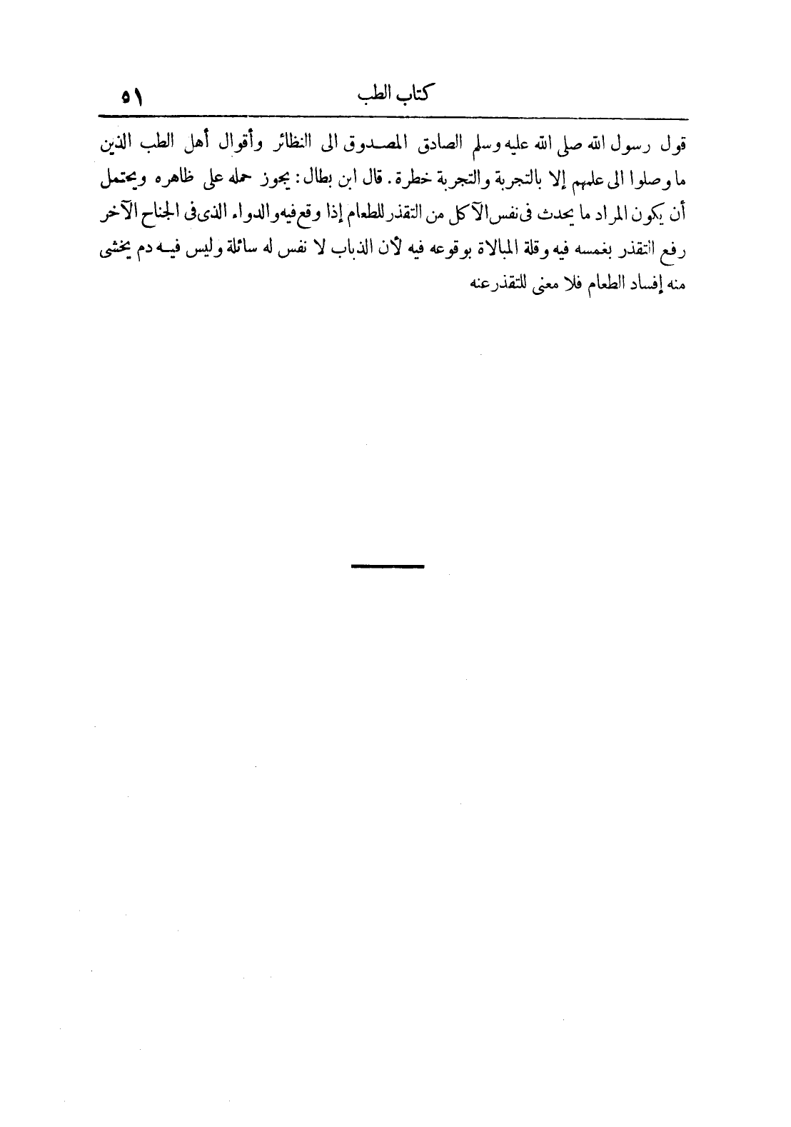 قول رسول الله صلى الله عليه وسلم الصادق المصدوق إلى النظائر وأقوال أهل الطب الذين ما وصلوا إلى علمهم إلا بالتجربة والتجربة خطرة. قال ابن بطال: يجوز حمله على ظاهره ويحتمل أن يكون المراد ما يحدث في نفس الآكل من التقذر للطعام إذا وقع فيه والدواء الذي في الجناح الآخر رفع التقذر بغمسه فيه وقلة المبالاة بوقوعه فيه لأن الذباب لا نفس له سائلة وليس فيه دم يخشى منه إفساد الطعام فلا معنى للتقذر عنه.