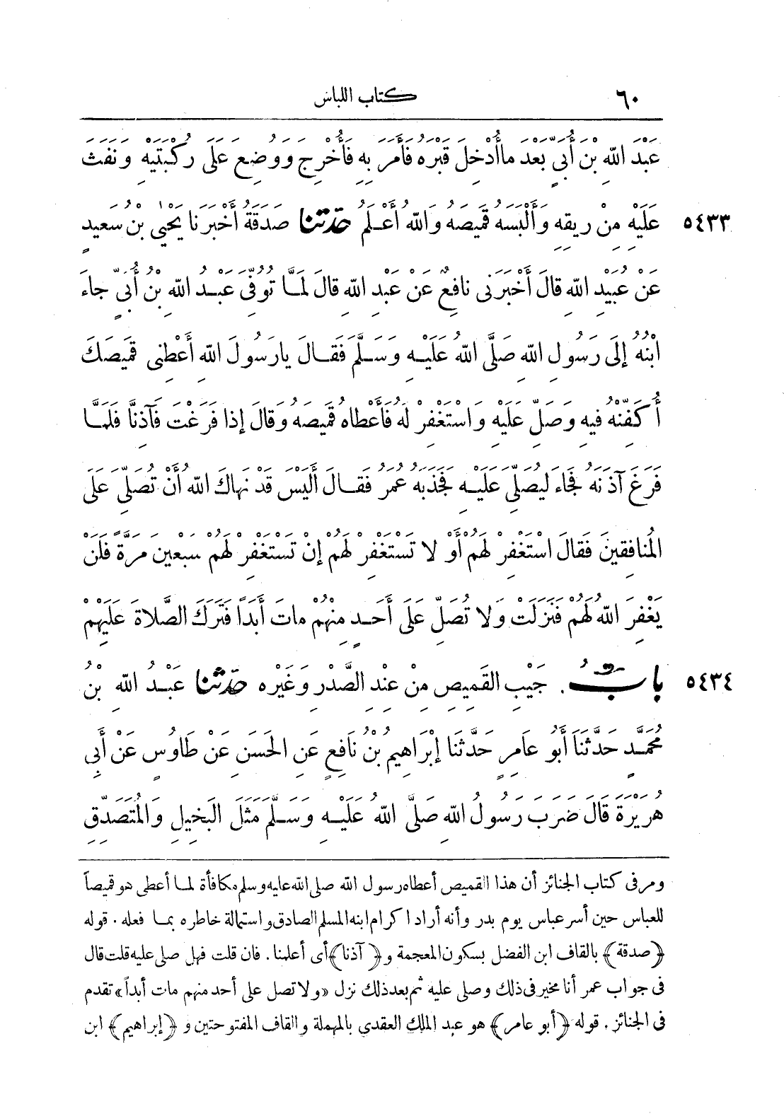 ومر في كتاب الجنائز أن هذا القميص أعطاه رسول الله صلى الله عليه وسلم مكافأة لما أعطى هو قميصًا للعباس حين أسر العباس يوم بدر وأنه أراد إكرام ابنه المسلم الصادق واستمالة خاطره بما فعله، قوله {صدقة} بالقاف ابن الفضل بسكون المعجمة و {آذنا} أي أعلمنا فإن قلت فهل صلى عليه قلت قال في جواب عمر أنا مخير في ذلك وصلى عليه ثم بعد ذلك نزل " ولا تصل على أحد منهم مات أبدا" تقدم في الجنائز، {باب جيب القميص من عند الصدر وغيره} قوله {أبو عامر} هو عبد الملك العقدي بالمهملة والقاف المفتوحتين و {إبراهيم} ابن