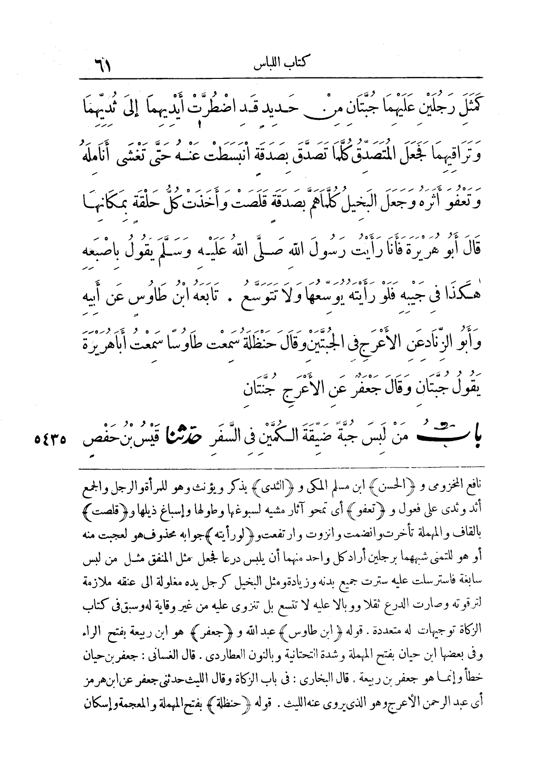 نافع المخزومي و {الحسن} ابن مسلم المكي و {الثدي} يذكر ويؤنث هو للمرأة والرجل والجمع أثد وثدي على فعول و {تعفو} أي تمحو آثار مشيه لسبوغها وطولها وإسباغ ذيلها و {قلصت} بالقاف والمهملة تأخرت وانضمت وانزوت وارتفعت و {لو رأيته} جوابه محذوف وهو لعجبت منه أو هو للتمني شبههما برجلين أراد كل واحد منهما أن يلبس درعا فجعل مثل المنفق مثل من لبس سابغة فاسترسلت عليه سترت جميع بدنه وزيادة ومثل البخيل كرجل يده مغلولة إلى عنقه ملازمة لترقوته وصارت الدرع ثقلا ووبالا عليه لا تتسع بل تنزوي عليه من غير وقاية له وسبق في كتاب الزكاة توجيهات له متعددة. قوله {ابن طاوس} عبد الله و {جعفر} هو ابن ربيعة بفتح الراء وفي بعضها ابن حيان بفتح المهملة وشدة التحتانية وبالنون العطاردي. قال الغساني: جعفر بن حيان خطأ وإنما هو جعفر بن ربيعة. قال البخاري: في باب الزكاة وقال الليث حدثني جعفر عن ابن هرمز أي عبد الرحمن الأعرج وهو الذي يروي عنه الليث. قوله {حنظلة} بفتح المهملة والمعجمة وإسكان