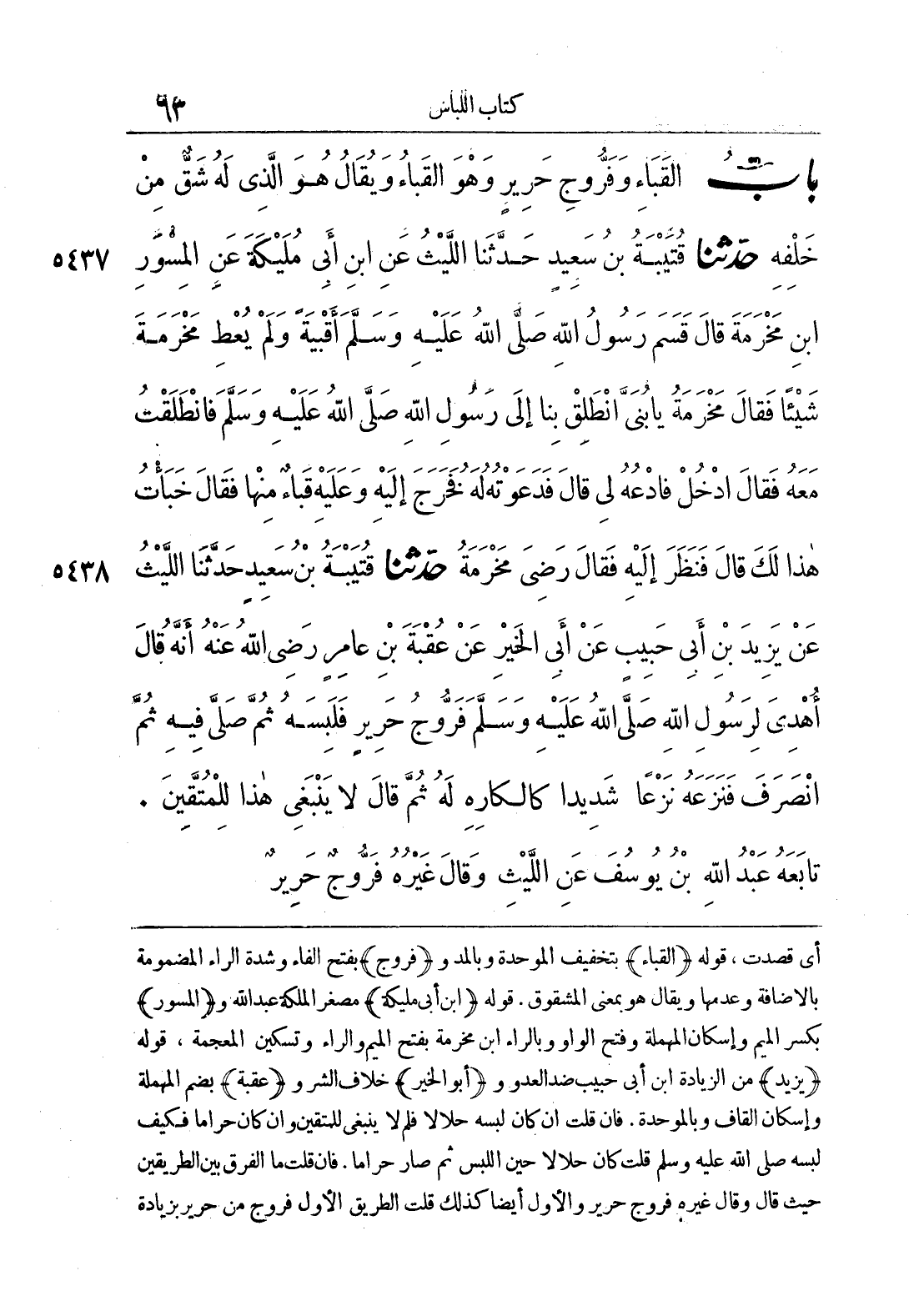 5438 - حَدَّثَنَا قُتَيْبَةُ بْنُ سَعِيدٍ حَدَّثَنَا اللَّيْثُ عَنْ يَزِيدَ بْنِ أَبِي حَبِيبٍ عَنْ أَبِي الْخَيْرِ عَنْ عُقْبَةَ بْنِ عَامِرٍ رَضِيَ اللَّهُ عَنْهُ أَنَّهُ قَالَ أُهْدِيَ لِرَسُولِ اللَّهِ صَلَّى اللَّهُ عَلَيْهِ وَسَلَّمَ فَرُّوجُ حَرِيرٍ فَلَبِسَهُ ثُمَّ صَلَّى فِيهِ ثُمَّ انْصَرَفَ فَنَزَعَهُ نَزْعًا شَدِيدًا كَالْكَارِهِ لَهُ ثُمَّ قَالَ لَا يَنْبَغِي هَذَا لِلْمُتَّقِينَ. تَابَعَهُ عَبْدُ اللَّهِ بْنُ يُوسُفَ عَنْ اللَّيْثِ وَقَالَ غَيْرُهُ فَرُّوجٌ حَرِيرٌ