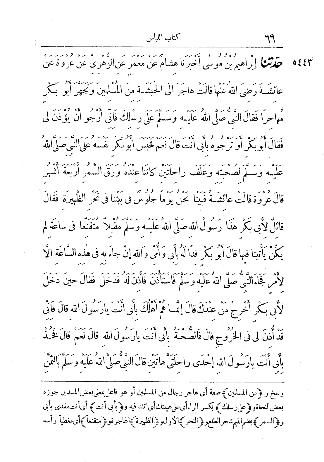 5443 - حَدَّثَنَا إِبْرَاهِيمُ بْنُ مُوسَى أَخْبَرَنَا هِشَامٌ عَنْ مَعْمَرٍ عَنْ الزُّهْرِيِّ عَنْ عُرْوَةَ عَنْ عَائِشَةَ رَضِيَ اللَّهُ عَنْهَا قَالَتْ هَاجَرَ نَاسٌ إِلَى الْحَبَشَةِ مِنْ الْمُسْلِمِينَ وَتَجَهَّزَ أَبُو بَكْرٍ مُهَاجِرًا فَقَالَ النَّبِيُّ صَلَّى اللَّهُ عَلَيْهِ وَسَلَّمَ عَلَى رِسْلِكَ فَإِنِّي أَرْجُو أَنْ يُؤْذَنَ لِي فَقَالَ أَبُو بَكْرٍ أَوَ تَرْجُوهُ بِأَبِي أَنْتَ قَالَ نَعَمْ فَحَبَسَ أَبُو بَكْرٍ نَفْسَهُ عَلَى النَّبِيِّ صَلَّى اللَّهُ عَلَيْهِ وَسَلَّمَ لِصُحْبَتِهِ وَعَلَفَ رَاحِلَتَيْنِ كَانَتَا عِنْدَهُ وَرَقَ السَّمُرِ أَرْبَعَةَ أَشْهُرٍ قَالَ عُرْوَةُ قَالَتْ عَائِشَةُ فَبَيْنَا نَحْنُ يَوْمًا جُلُوسٌ فِي بَيْتِنَا فِي نَحْرِ الظَّهِيرَةِ فَقَالَ قَائِلٌ لِأَبِي بَكْرٍ هَذَا رَسُولُ اللَّهِ صَلَّى اللَّهُ عَلَيْهِ وَسَلَّمَ مُقْبِلًا مُتَقَنِّعًا فِي سَاعَةٍ لَمْ يَكُنْ يَاتِينَا فِيهَا قَالَ أَبُو بَكْرٍ فِدًا لَكَ أَبِي وَأُمِّي وَاللَّهِ إِنْ جَاءَ بِهِ فِي هَذِهِ السَّاعَةِ إِلَّا لِأَمْرٍ فَجَاءَ النَّبِيُّ صَلَّى اللَّهُ عَلَيْهِ وَسَلَّمَ فَاسْتَاذَنَ فَأَذِنَ لَهُ فَدَخَلَ فَقَالَ حِينَ دَخَلَ لِأَبِي بَكْرٍ أَخْرِجْ مَنْ عِنْدَكَ قَالَ إِنَّمَا هُمْ أَهْلُكَ بِأَبِي أَنْتَ يَا رَسُولَ اللَّهِ قَالَ فَإِنِّي قَدْ أُذِنَ لِي فِي الْخُرُوجِ قَالَ فَالصُّحْبَةُ بِأَبِي أَنْتَ وَأُمِّي يَا رَسُولَ اللَّهِ قَالَ نَعَمْ قَالَ فَخُذْ بِأَبِي أَنْتَ يَا رَسُولَ اللَّهِ إِحْدَى رَاحِلَتَيَّ هَاتَيْنِ قَالَ النَّبِيُّ صَلَّى اللَّهُ عَلَيْهِ وَسَلَّمَ بِالثَّمَنِ