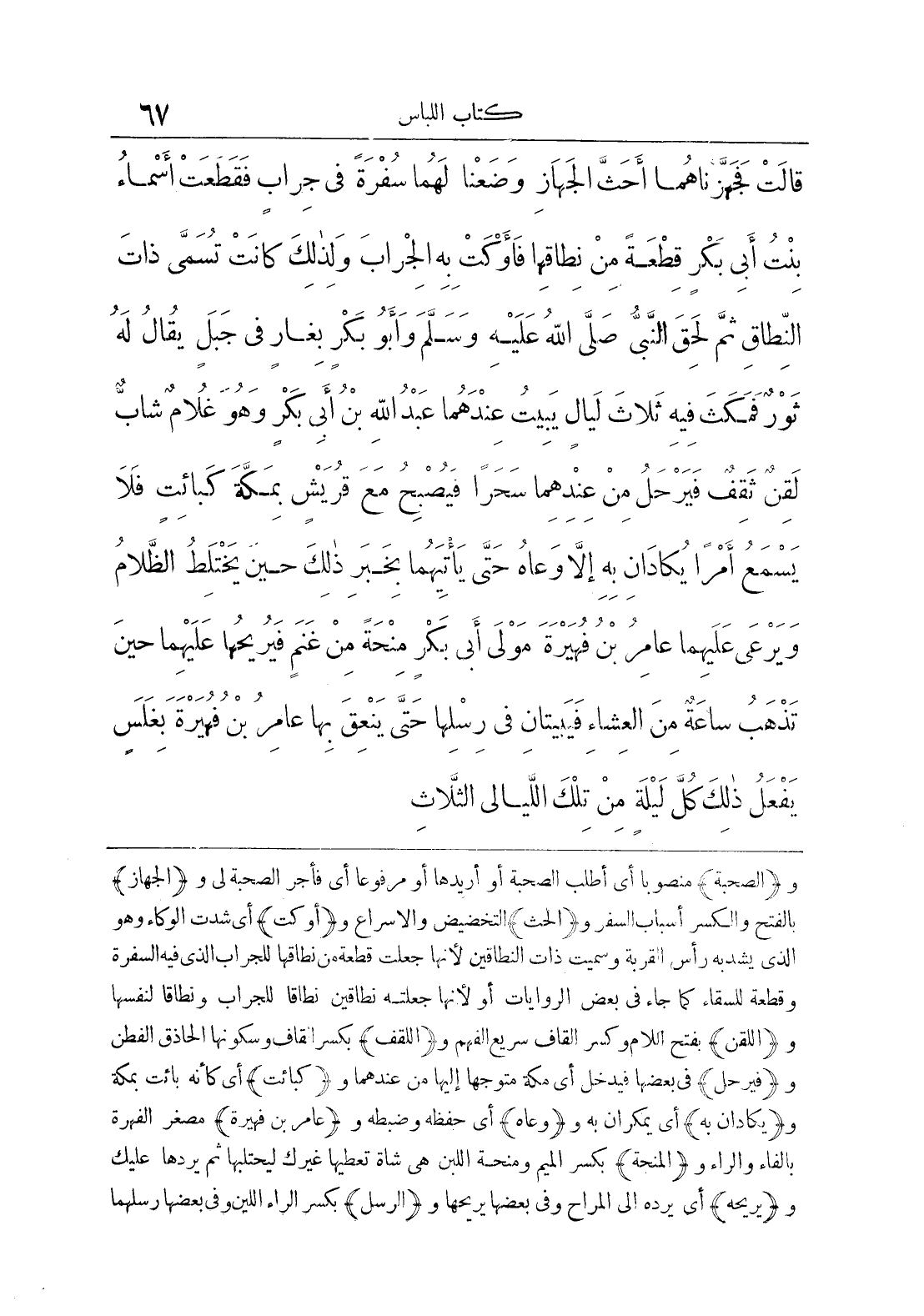 و {الصحبة} منصوبا أي أطلب الصحبة أو أريدها أو مرفوعا أي فأجر الصحبة لي و {الجهاز} بالفتح والكسر أسباب السفر و {الحث} التحضيض والإسراع و {أوكت} أي شدت الوكاء وهو الذي يشد به رأس القربة وسميت ذات النطاقين لأنها جعلت قطعة من نطاقها للجراب الذي فيه السفرة وقطعة للسقاء كما جاء في بعض الروايات أو لأنها جعلته نطاقين نطاقا للجراب ونطاقا لنفسها و {اللقن} بفتح اللام وكسر القاف سريع الفهم و {اللقف} بكسر القاف وسكونها الحاذق الفطن و {فيرحل} في بعضها فيدخل أي مكة متوجها إليها من عندهما و {كبائت} أي كأنه بائت بمكة و {يكادان به} أي يمكران به و {وعاه} أي حفظه وضبطه و {عامر بن فهيرة} مصغر الفهرة بالفاء والراء و {المنجة} بكسر الميم ومنحة اللبن هي شاة تعطيها غيرك ليحتلبها ثم يردها عليك و {يريحه} أي يرده إلى المراح وفي بعضها يريحها و {الرسل} بكسر الراء اللين وفي بعضها رسلهما