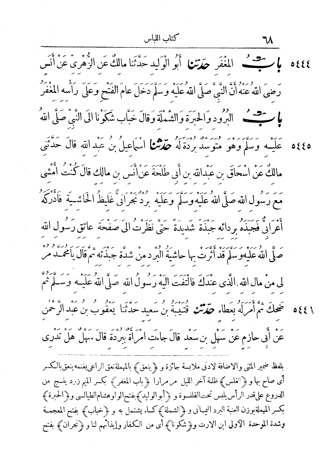 بلفظ ضمير المثنى والإضافة لأدنى ملابسة جائزة و {ينعق} بالمهملة نعق الراعي بغنمه ينعق بالكسر أي صاح بها، و {الغلس} ظلمة آخر الليل مر مرارا. {باب المغفر} بكسر الميم زرد ينسج من الدروع على قدر الرأس يلبس تحت القلنسوة و {أبو الوليد} بفتح الواو هشام الطيالسي. {باب البرود والحبرة والشملة} و {الحبرة} بكسر المهملة بوزن العنبة البرد اليماني و {الشملة} كساء يشتمل به و {خباب} بفتح المعجة وشدة الموحدة الأولى ابن الأرت و {شكونا} أي من الكفار إيذائهم لنا و {نجران} بفتح