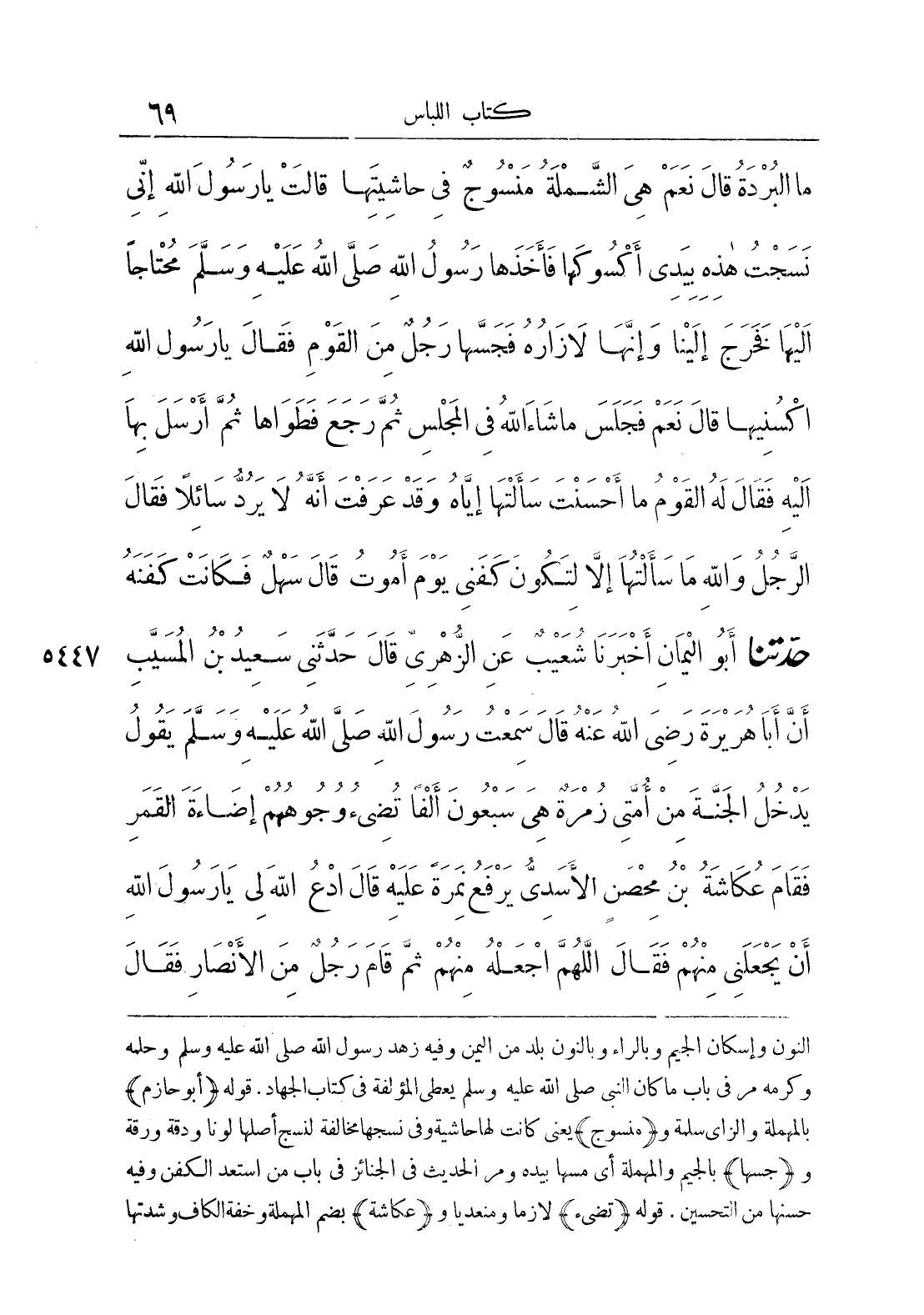 5447 - حَدَّثَنَا أَبُو الْيَمَانِ أَخْبَرَنَا شُعَيْبٌ عَنْ الزُّهْرِيِّ قَالَ حَدَّثَنِي سَعِيدُ بْنُ الْمُسَيَّبِ أَنَّ أَبَا هُرَيْرَةَ رَضِيَ اللَّهُ عَنْهُ قَالَ سَمِعْتُ رَسُولَ اللَّهِ صَلَّى اللَّهُ عَلَيْهِ وَسَلَّمَ يَقُولُ يَدْخُلُ الْجَنَّةَ مِنْ أُمَّتِي زُمْرَةٌ هِيَ سَبْعُونَ أَلْفًا تُضِيءُ وُجُوهُهُمْ إِضَاءَةَ الْقَمَرِ فَقَامَ عُكَاشَةُ بْنُ مِحْصَنٍ الْأَسَدِيُّ يَرْفَعُ نَمِرَةً عَلَيْهِ قَالَ ادْعُ اللَّهَ لِي يَا رَسُولَ اللَّهِ أَنْ يَجْعَلَنِي مِنْهُمْ فَقَالَ اللَّهُمَّ اجْعَلْهُ مِنْهُمْ ثُمَّ قَامَ رَجُلٌ مِنْ الْأَنْصَارِ فَقَالَ