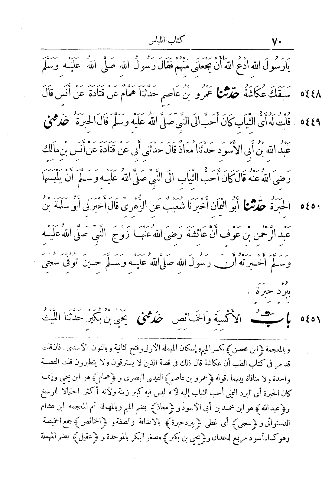 وبالمعجمة {ابن محصن} بكسر الميم وإسكان المهملة الأولى وفتح الثانية وبالنون الأسدي، فإن قلت فقد مر في كتاب الطب أن عكاشة قال ذلك في قصة الذين لا يسترقون ولا يتطيرون قلت القصة واحدة ولا منافاة بينهما. قوله {عمرو بن عاصم} القيسي البصري و {همام} هو ابن يحيى وإنما كان الحبرة أي البرد اليمنى أحب الثياب إليه لأنه ليس فيه كبير زينة ولأنه أكثر احتمالا للوسخ. و {عبد الله} هو ابن محمد بن أبي الأسود و {معاذ} بضم الميم بالمهملة ثم المعجمة ابن هشام الدستوائي و {سجى} أي غطى {ببرد حبرة} بالإضافة والصفة. {باب الأكسية والخمائص} و {الخمائص} جمع الخميصة وهو كساء أسود مربع له علمان و {يحيى بن بكير} مصغر البكر بالموحدة و {عقيل} بضم المهملة