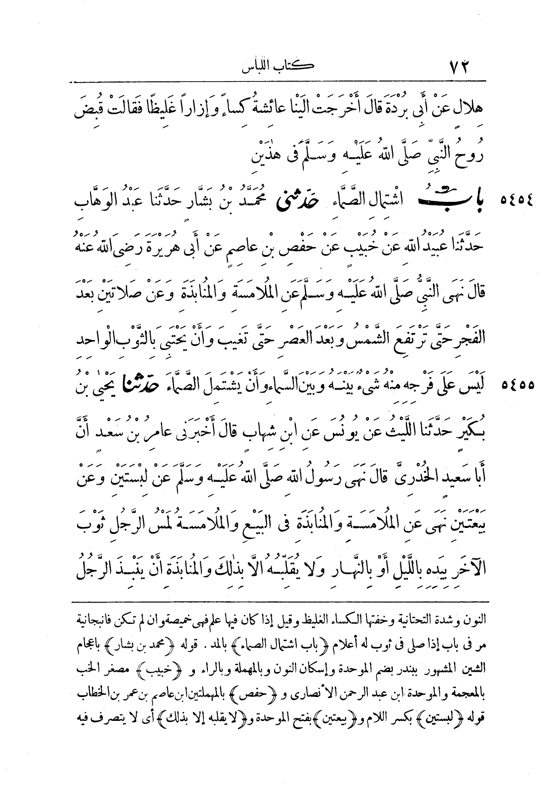 النون وشدة التحتانية وخفتها الكساء العريض وقيل إذا كان فيها علم فهي خميصة وإن لم تكن فانبجانية مر في باب إذا صلى في ثوب له أعلام. {باب اشتمال الصماء} بالمد قوله {محمد بن بشار} بإعجام الشين المشهور ببندر بضم الموحدة وإسكان النون وبالمهملة والراء و {خبيب} مصغر الخب بالمعجمة والموحدة ابن عبد الرحمن الأنصاري و {حفص} بالمهملتين ابن عاصم بن عمر بن الخطاب قوله {لبستين} بكسر اللام و {بيعتين} بفتح الموحدة و {لا يقلبه إلا بذلك} أي لا يتصرف فيه