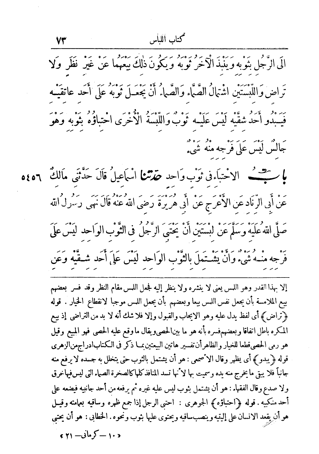 إلا بهذا القدر وهو اللمس يعني لا ينشره ولا ينظر إليه فجعل اللمس مقام النظر وقد فسر بعضهم بيع الملامسة بأن يجعل نفس اللمس بيعا وبعضهم بأن يجعل اللمس موجبا لانقطاع الخيار، قوله {تراض} أي لفظ يدل عليه وهو الإيجاب والقبول وإلا فلا شك أنه لابد من التراضي إذ بيع المكره باطل اتفاقا وبعضهم فسره بأنه هو ما بين الحصى ويقال ما وقع عليه الحصى فهو المبيع وقيل هو رمي الحصى قطعا للخيار والظاهر أن تفسير هاتين البيعتين بما ذكر في الكتاب إدراج من الزهري قوله {يبدو} أي يظهر وقال الأصمعي: هو أن يشتمل بالثوب حتى يتخلل به جسده لا يرفع منه جانبا فلا يبقى ما يخرج منه يده وسميت بها لأنها تسد المنافذ كلها كالصخرة الصماء التي ليس فيها خرق ولا صدع وقال الفقهاء: هو أن يشتمل بثوب ليس عليه غيره ثم يرفعه من أحد جانبيه فيضعه على أحد منكبيه. قوله {إحتباؤه} الجوهري: احتبى الرجل إذا جمع ظهره وساقيه بعمامته وقيل هو أن يقعد الإنسان على إليتيه وينصب ساقيه ويحتوي عليها بثوب ونحوه. الخطابي: هو أن يحتبي