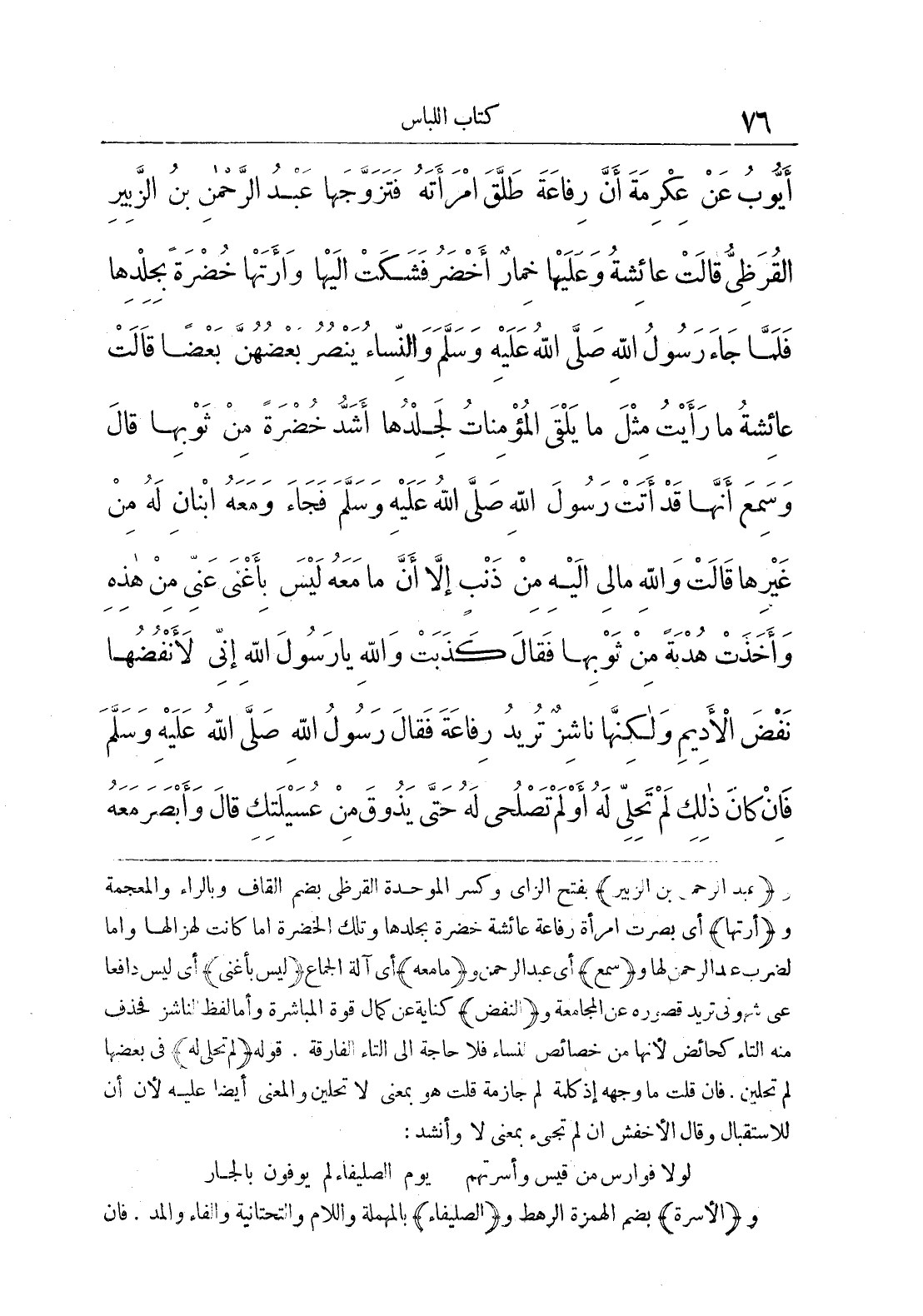 أَيُّوبُ عَنْ عِكْرِمَةَ أَنَّ رِفَاعَةَ طَلَّقَ امْرَأَتَهُ فَتَزَوَّجَهَا عَبْدُ الرَّحْمَنِ بْنُ الزَّبِيرِ الْقُرَظِيُّ قَالَتْ عَائِشَةُ وَعَلَيْهَا خِمَارٌ أَخْضَرُ فَشَكَتْ إِلَيْهَا وَأَرَتْهَا خُضْرَةً بِجِلْدِهَا فَلَمَّا جَاءَ رَسُولُ اللَّهِ صَلَّى اللَّهُ عَلَيْهِ وَسَلَّمَ وَالنِّسَاءُ يَنْصُرُ بَعْضُهُنَّ بَعْضًا قَالَتْ عَائِشَةُ مَا رَأَيْتُ مِثْلَ مَا يَلْقَى الْمُؤْمِنَاتُ لَجِلْدُهَا أَشَدُّ خُضْرَةً مِنْ ثَوْبِهَا قَالَ وَسَمِعَ أَنَّهَا قَدْ أَتَتْ رَسُولَ اللَّهِ صَلَّى اللَّهُ عَلَيْهِ وَسَلَّمَ فَجَاءَ وَمَعَهُ ابْنَانِ لَهُ مِنْ غَيْرِهَا قَالَتْ وَاللَّهِ مَا لِي إِلَيْهِ مِنْ ذَنْبٍ إِلَّا أَنَّ مَا مَعَهُ لَيْسَ بِأَغْنَى عَنِّي مِنْ هَذِهِ وَأَخَذَتْ هُدْبَةً مِنْ ثَوْبِهَا فَقَالَ كَذَبَتْ وَاللَّهِ يَا رَسُولَ اللَّهِ إِنِّي لَأَنْفُضُهَا نَفْضَ الْأَدِيمِ وَلَكِنَّهَا نَاشِزٌ تُرِيدُ رِفَاعَةَ فَقَالَ رَسُولُ اللَّهِ صَلَّى اللَّهُ عَلَيْهِ وَسَلَّمَ فَإِنْ كَانَ ذَلِكِ لَمْ تَحِلِّي لَهُ أَوْ لَمْ تَصْلُحِي لَهُ حَتَّى يَذُوقَ مِنْ عُسَيْلَتِكِ قَالَ وَأَبْصَرَ مَعَهُ