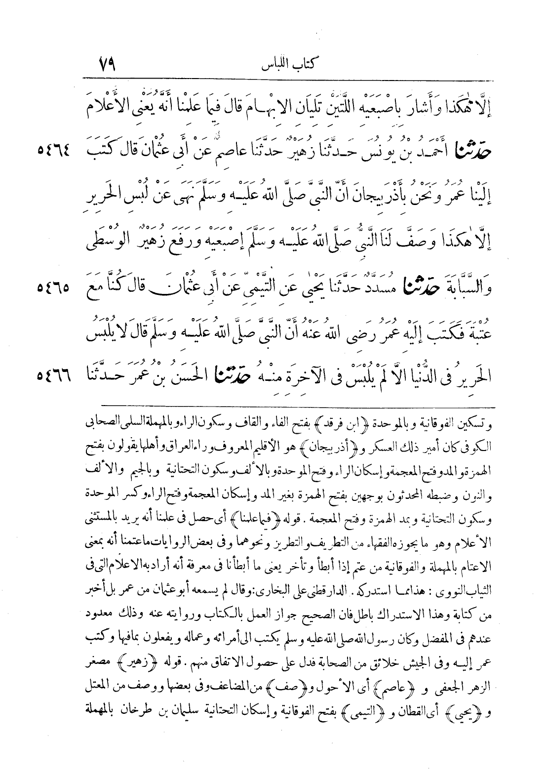 5464 - حَدَّثَنَا أَحْمَدُ بْنُ يُونُسَ حَدَّثَنَا زُهَيْرٌ حَدَّثَنَا عَاصِمٌ عَنْ أَبِي عُثْمَانَ قَالَ كَتَبَ إِلَيْنَا عُمَرُ وَنَحْنُ بِأَذْرَبِيجَانَ أَنَّ النَّبِيَّ صَلَّى اللَّهُ عَلَيْهِ وَسَلَّمَ نَهَى عَنْ لُبْسِ الْحَرِيرِ إِلَّا هَكَذَا وَصَفَّ لَنَا النَّبِيُّ صَلَّى اللَّهُ عَلَيْهِ وَسَلَّمَ إِصْبَعَيْهِ وَرَفَعَ زُهَيْرٌ الْوُسْطَى وَالسَّبَّابَةَ