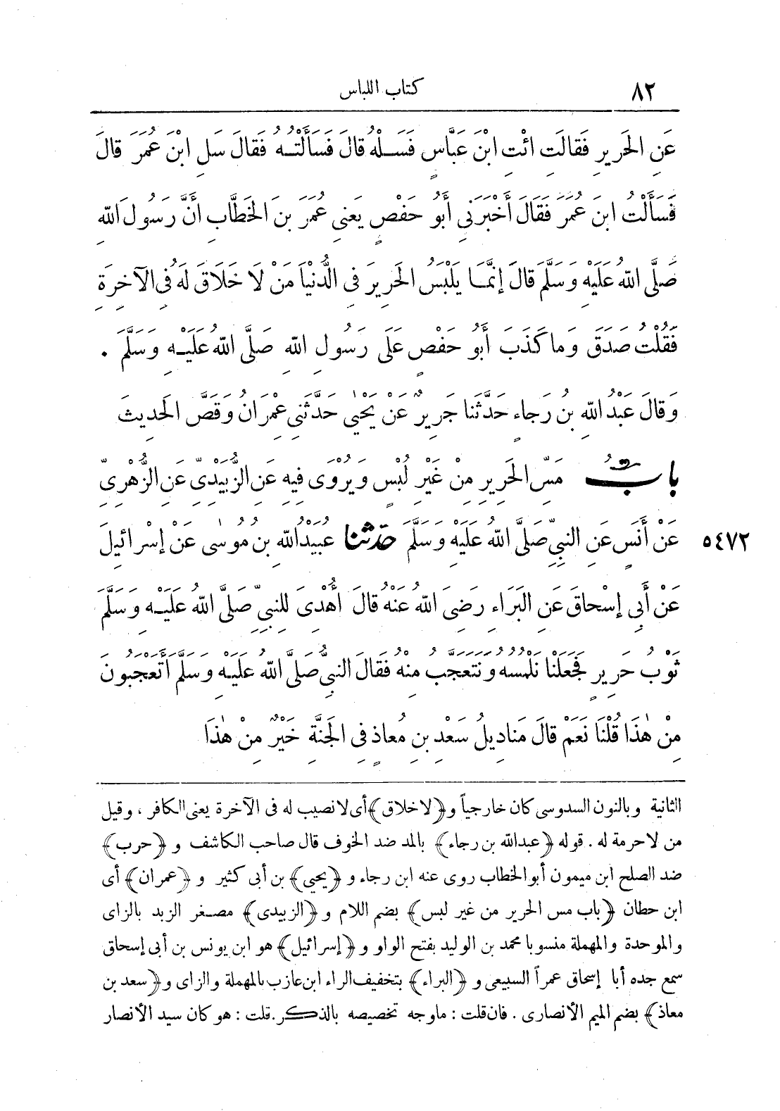 الثانية وبالنون السدوسي كان خارجيا و {لا خلاق} أي لا نصيب له في الآخرة يعني الكافر، وقيل من لا حرمة له. قوله {عبد الله بن رجاء} بالمد ضد الخوف قال صاحب الكاشف و {حرب} ضد الصلح ابن ميمون أبو الخطاب روى عنه ابن رجاء و {يحيى} بن أبي كثير و {عمران} أي ابن حطان. {باب مس الحرير من غير لبس} بضم اللام و {الزبيدي} مصغر الزبد بالزاي والموحدة والمهملة منسوبا محمد بن الوليد بفتح الواو و {إسرائيل} هو ابن يونس بن أبي إسحاق سمع جده أبا إسحاق عمرا السبيعي و {البراء} بتخفيف الراء ابن عازب بالمهملة والزاي و {سعد بن معاذ} بضم الميم الأنصاري، فإن قلت ما وجه تخصيصه بالذكر، قلت: هو كان سيد الأنصار