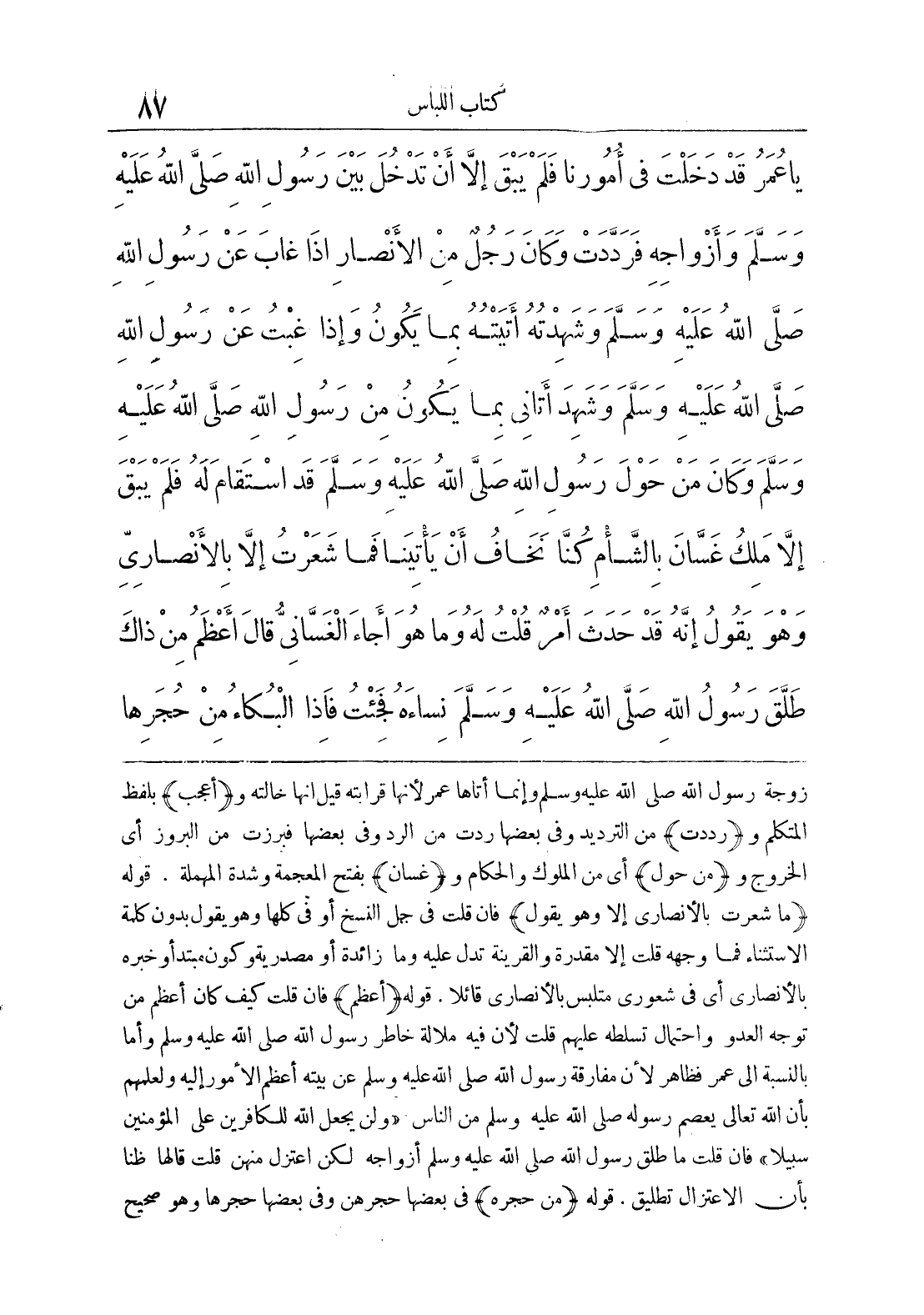 زوجة رسول الله صلى الله عليه وسلم وإنما أتاها عمر لأنها قرابته قيل إنها خالته و {أعجب} بلفظ المتكلم و {رددت} من الترديد وفي بعضها ردت من الرد وفي بعضها فبرزت من البروز أي الخروج و {من حول} أي من الملوك والحكام و {غسان} بفتح المعجمة وشدة المهملة. قوله {ما شعرت بالأنصاري إلا وهو يقول} فإن قلت في جل النسخ أو في كلها وهو يقول بدون كلمة الاستثناء فما وجهه قلت إلا مقدرة والقرينة تدل عليه وما زائدة أو مصدرية وكون مبتدأ وخبره بالأنصاري أي في شعوري متلبس بالأنصاري قائلا. قوله {أعظم} فإن قلت كيف كان أعظم من توجه العدو واحتمال تسلطه عليهم قلت لأن فيه ملالة خاطر رسول الله صلى الله عليه وسلم وأما بالنسبة إلى عمر فظاهر لأن مفارقة رسول الله صلى الله عليه وسلم عن بيته أعظم الأمور إليه ولعلمهم بأن الله تعالى يعصم رسوله صلى الله عليه وسلم من الناس " ولن يجعل الله للكافرين على المؤمنين سبيلا " فإن قلت ما طلق رسول الله صلى الله عليه وسلم أزواجه لكن اعتزل منهن قلت قالها ظنا بأن الاعتزال تطليق، قوله {من حجره} في بعضها حجرهن وفي بعضها حجرها وهو صحيح