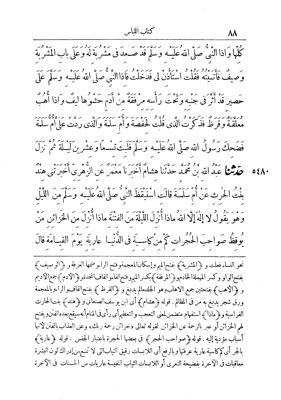 نحو النساء فعلت و {المشربة} بفتح الميم وإسكان المعجمة وفتح الراء وضمها الغرفة و {الوصيف} بفتح الواو وكسر المهملة الخادم و {المرفقة} بكسر الميم وفتح الفاء والقاف المخدة و {الأدم} جمع الأديم و {الأهب} بفتحتين جمع الإهاب وهو الجلد مالم يدبغ و {القرظ} بفتح القاف والراء وبالمعجمة ورق شجر يدبغ به مر في المظالم. قوله {هشام} أي ابن يوسف الصنعاني و {هند} بنت الحارث الفراسية و {ماذا} استفهام متضمن لمعنى التعجب والتعظيم أي رأى في المنام أنه سيقع بعده الفتن ويفتح لهم الخزائن أو عبر بالرحمة عن الخزائن لقوله تعالى " خزائن رحمة ربك " وعن العذاب بالفتن لأنها أسباب مؤدية إليه، قوله {صواحب الحجر} في بعضها الحجرة باعتبار الجنس، قوله {عارية} بالجر أي كم كاسية عارية عرفتها وبالرفع أي اللابسات رقيق الثياب التي لا تمنع من إدراك لون البشرة معاقبات يوم القيامة بفضيحة التعري أو اللابسات الثياب النفيسة عاريات من الحسنات في الآخرة