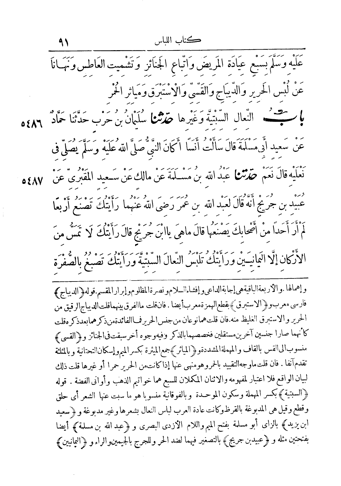 5486 - حَدَّثَنَا سُلَيْمَانُ بْنُ حَرْبٍ حَدَّثَنَا حَمَّادُ بْنُ زَيْدٍ عَنْ سَعِيدٍ أَبِي مَسْلَمَةَ قَالَ سَأَلْتُ أَنَسًا أَكَانَ النَّبِيُّ صَلَّى اللَّهُ عَلَيْهِ وَسَلَّمَ يُصَلِّي فِي نَعْلَيْهِ قَالَ نَعَمْ