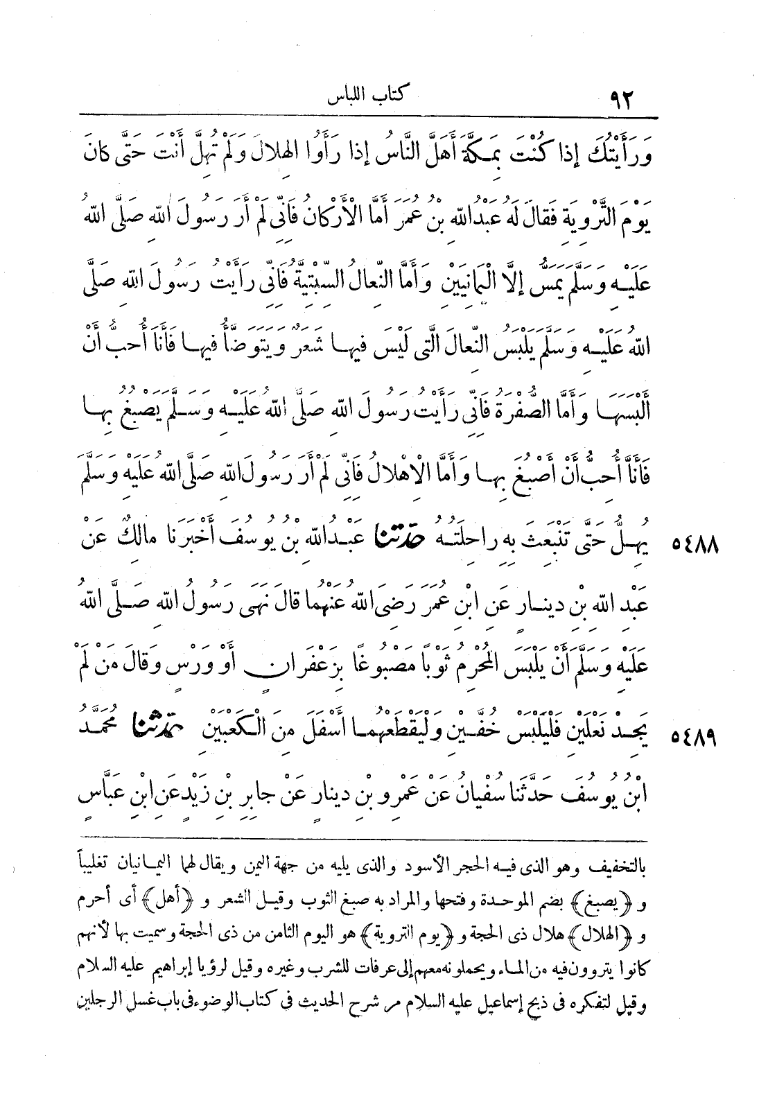 5488 - حَدَّثَنَا عَبْدُ اللَّهِ بْنُ يُوسُفَ أَخْبَرَنَا مَالِكٌ عَنْ عَبْدِ اللَّهِ بْنِ دِينَارٍ عَنْ عَبْدِ اللَّهِ بْنِ عُمَرَ رَضِيَ اللَّهُ عَنْهُمَا قَالَ نَهَى رَسُولُ اللَّهِ صَلَّى اللَّهُ عَلَيْهِ وَسَلَّمَ أَنْ يَلْبَسَ الْمُحْرِمُ ثَوْبًا مَصْبُوغًا بِزَعْفَرَانٍ أَوْ وَرْسٍ وَقَالَ مَنْ لَمْ يَجِدْ نَعْلَيْنِ فَلْيَلْبَسْ خُفَّيْنِ وَلْيَقْطَعْهُمَا أَسْفَلَ مِنْ الْكَعْبَيْنِ