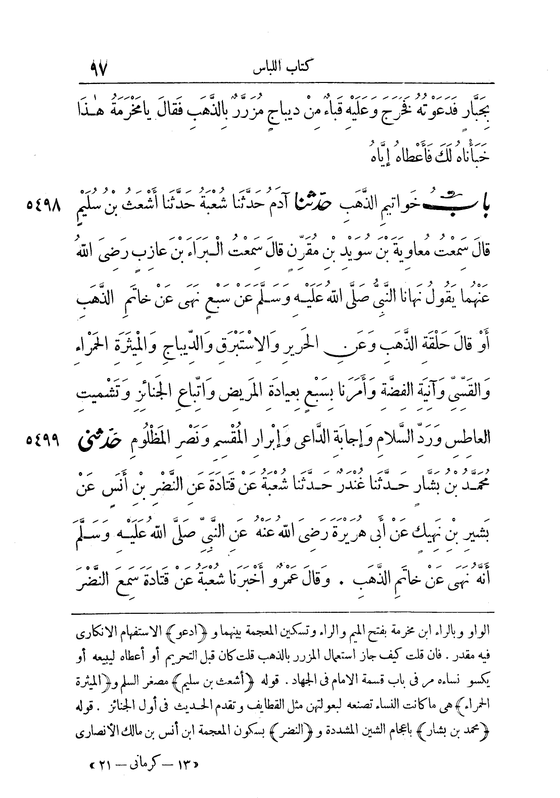الواو وبالراء ابن مخزمة بفتح الميم والراء وتسكين المعجمة بينهما و {أدعو} الاستفهام الإنكاري فيه مقدر، فإن قلت كيف جاز استعمال المزرر بالذهب قلت كان قبل التحريم أو أعطاه إياه ليبيعه أو يكسو نساءه مر في باب قسمة الإمام في الجهاد. {باب خواتيم الذهب} قوله {أشعث بن سليم} مصغر السلم و {الميثرة الحمراء} هي ما كانت النساء تصنعه لبعولتهن مثل القطايف وتقدم الحديث في أول الجنائز. قوله {محمد بن بشار} بإعجام الشين المشددة و {النضر} بسكون المعجمة ابن أنس بن مالك الأنصاري