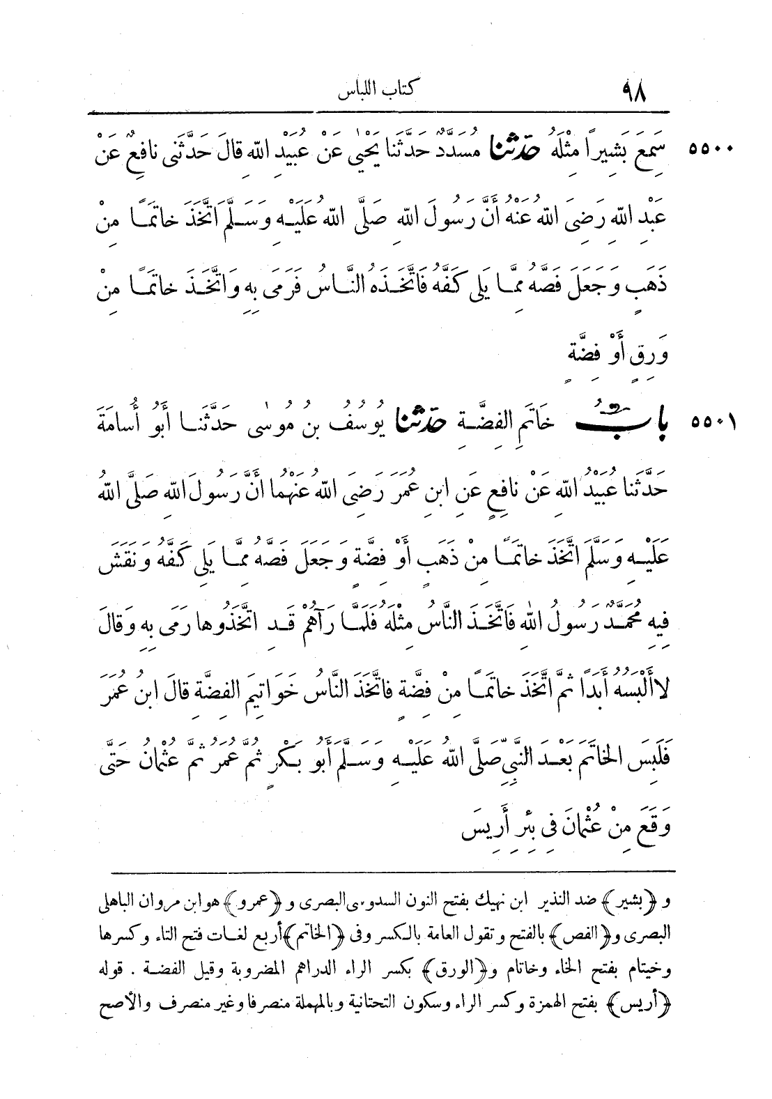 5501 - حَدَّثَنَا يُوسُفُ بْنُ مُوسَى حَدَّثَنَا أَبُو أُسَامَةَ حَدَّثَنَا عُبَيْدُ اللَّهِ عَنْ نَافِعٍ عَنْ ابْنِ عُمَرَ رَضِيَ اللَّهُ عَنْهُمَا أَنَّ رَسُولَ اللَّهِ صَلَّى اللَّهُ عَلَيْهِ وَسَلَّمَ اتَّخَذَ خَاتَمًا مِنْ ذَهَبٍ أَوْ فِضَّةٍ وَجَعَلَ فَصَّهُ مِمَّا يَلِي كَفَّهُ وَنَقَشَ فِيهِ مُحَمَّدٌ رَسُولُ اللَّهِ فَاتَّخَذَ النَّاسُ مِثْلَهُ فَلَمَّا رَآهُمْ قَدْ اتَّخَذُوهَا رَمَى بِهِ وَقَالَ لَا أَلْبَسُهُ أَبَدًا ثُمَّ اتَّخَذَ خَاتَمًا مِنْ فِضَّةٍ فَاتَّخَذَ النَّاسُ خَوَاتِيمَ الْفِضَّةِ قَالَ ابْنُ عُمَرَ فَلَبِسَ الْخَاتَمَ بَعْدَ النَّبِيِّ صَلَّى اللَّهُ عَلَيْهِ وَسَلَّمَ أَبُو بَكْرٍ ثُمَّ عُمَرُ ثُمَّ عُثْمَانُ حَتَّى وَقَعَ مِنْ عُثْمَانَ فِي بِئْرِ أَرِيسَ