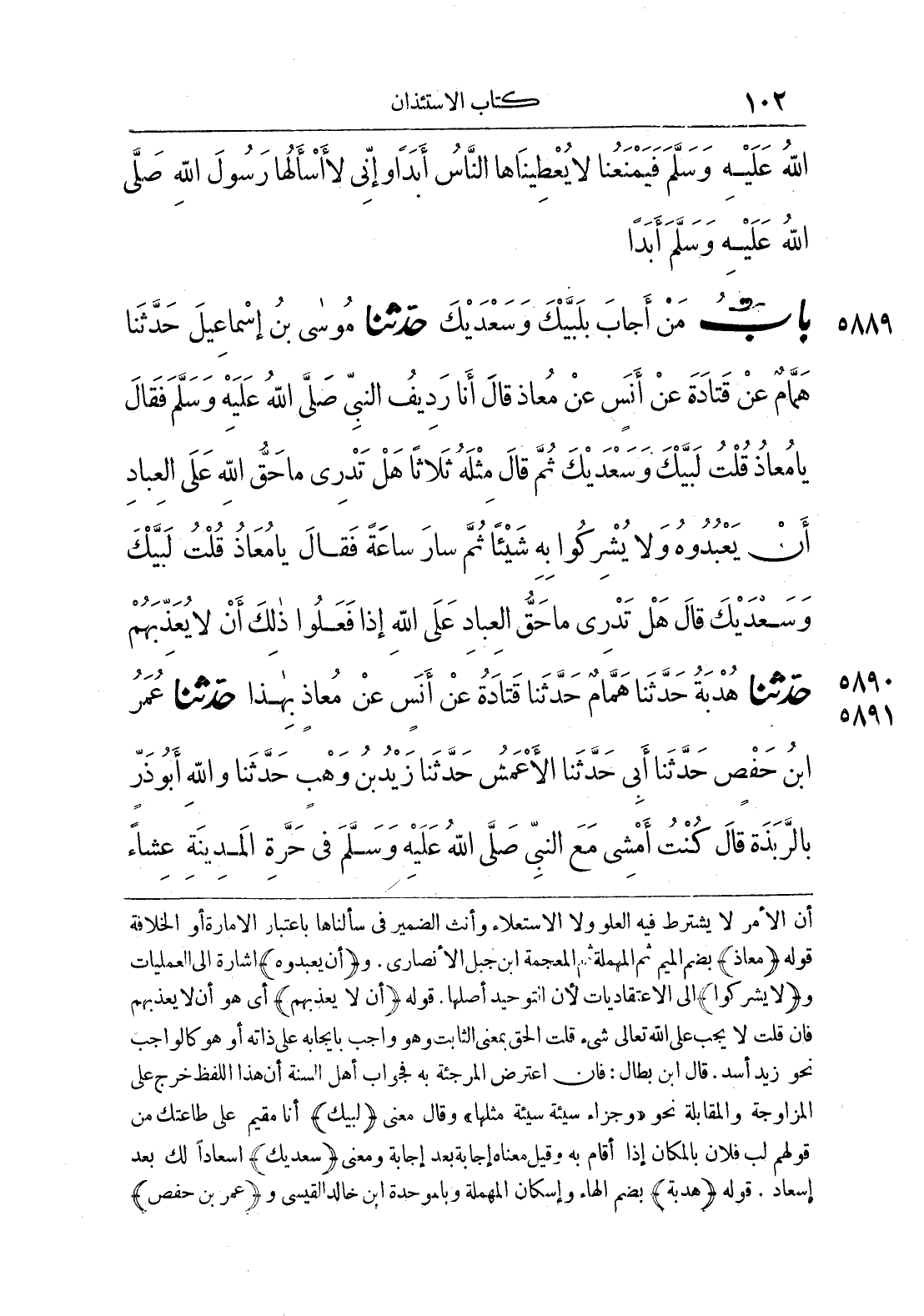 5889 - حَدَّثَنَا مُوسَى بْنُ إِسْمَاعِيلَ حَدَّثَنَا هَمَّامٌ عَنْ قَتَادَةَ عَنْ أَنَسٍ عَنْ مُعَاذٍ قَالَ أَنَا رَدِيفُ النَّبِيِّ صَلَّى اللَّهُ عَلَيْهِ وَسَلَّمَ فَقَالَ يَا مُعَاذُ قُلْتُ لَبَّيْكَ وَسَعْدَيْكَ ثُمَّ قَالَ مِثْلَهُ ثَلَاثًا هَلْ تَدْرِي مَا حَقُّ اللَّهِ عَلَى الْعِبَادِ قُلْتُ لَا قَالَ حَقُّ اللَّهِ عَلَى الْعِبَادِ أَنْ يَعْبُدُوهُ وَلَا يُشْرِكُوا بِهِ شَيْئًا ثُمَّ سَارَ سَاعَةً فَقَالَ يَا مُعَاذُ قُلْتُ لَبَّيْكَ وَسَعْدَيْكَ قَالَ هَلْ تَدْرِي مَا حَقُّ الْعِبَادِ عَلَى اللَّهِ إِذَا فَعَلُوا ذَلِكَ أَنْ لَا يُعَذِّبَهُمْ
