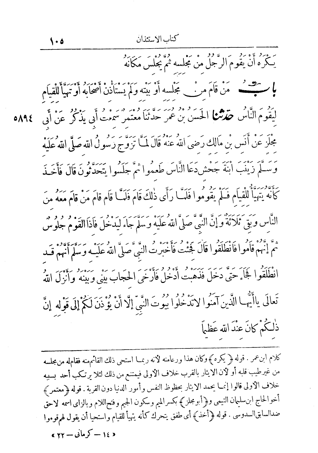 5894 - حَدَّثَنَا الْحَسَنُ بْنُ عُمَرَ حَدَّثَنَا مُعْتَمِرٌ سَمِعْتُ أَبِي يَذْكُرُ عَنْ أَبِي مِجْلَزٍ عَنْ أَنَسِ بْنِ مَالِكٍ رَضِيَ اللَّهُ عَنْهُ قَالَ لَمَّا تَزَوَّجَ رَسُولُ اللَّهِ صَلَّى اللَّهُ عَلَيْهِ وَسَلَّمَ زَيْنَبَ بِنْتَ جَحْشٍ دَعَا النَّاسَ طَعِمُوا ثُمَّ جَلَسُوا يَتَحَدَّثُونَ قَالَ فَأَخَذَ كَأَنَّهُ يَتَهَيَّأُ لِلْقِيَامِ فَلَمْ يَقُومُوا فَلَمَّا رَأَى ذَلِكَ قَامَ فَلَمَّا قَامَ قَامَ مَنْ قَامَ مَعَهُ مِنْ النَّاسِ وَبَقِيَ ثَلَاثَةٌ وَإِنَّ النَّبِيَّ صَلَّى اللَّهُ عَلَيْهِ وَسَلَّمَ جَاءَ لِيَدْخُلَ فَإِذَا الْقَوْمُ جُلُوسٌ ثُمَّ إِنَّهُمْ قَامُوا فَانْطَلَقُوا قَالَ فَجِئْتُ فَأَخْبَرْتُ النَّبِيَّ صَلَّى اللَّهُ عَلَيْهِ وَسَلَّمَ أَنَّهُمْ قَدْ انْطَلَقُوا فَجَاءَ حَتَّى دَخَلَ فَذَهَبْتُ أَدْخُلُ فَأَرْخَى الْحِجَابَ بَيْنِي وَبَيْنَهُ وَأَنْزَلَ اللَّهُ تَعَالَى {يَا أَيُّهَا الَّذِينَ آمَنُوا لَا تَدْخُلُوا بُيُوتَ النَّبِيِّ إِلَّا أَنْ يُؤْذَنَ لَكُمْ إِلَى قَوْلِهِ إِنَّ ذَلِكُمْ كَانَ عِنْدَ اللَّهِ عَظِيمًا}