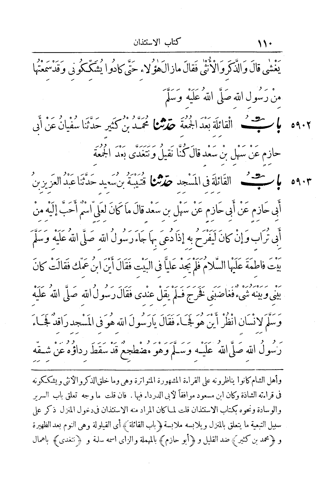 5903 - حَدَّثَنَا قُتَيْبَةُ بْنُ سَعِيدٍ حَدَّثَنَا عَبْدُ الْعَزِيزِ بْنُ أَبِي حَازِمٍ عَنْ أَبِي حَازِمٍ عَنْ سَهْلِ بْنِ سَعْدٍ قَالَ مَا كَانَ لِعَلِيٍّ اسْمٌ أَحَبَّ إِلَيْهِ مِنْ أَبِي تُرَابٍ وَإِنْ كَانَ لَيَفْرَحُ بِهِ إِذَا دُعِيَ بِهَا جَاءَ رَسُولُ اللَّهِ صَلَّى اللَّهُ عَلَيْهِ وَسَلَّمَ بَيْتَ فَاطِمَةَ عَلَيْهَا السَّلَام فَلَمْ يَجِدْ عَلِيًّا فِي الْبَيْتِ فَقَالَ أَيْنَ ابْنُ عَمِّكِ فَقَالَتْ كَانَ بَيْنِي وَبَيْنَهُ شَيْءٌ فَغَاضَبَنِي فَخَرَجَ فَلَمْ يَقِلْ عِنْدِي فَقَالَ رَسُولُ اللَّهِ صَلَّى اللَّهُ عَلَيْهِ وَسَلَّمَ لِإِنْسَانٍ انْظُرْ أَيْنَ هُوَ فَجَاءَ فَقَالَ يَا رَسُولَ اللَّهِ هُوَ فِي الْمَسْجِدِ رَاقِدٌ فَجَاءَ رَسُولُ اللَّهِ صَلَّى اللَّهُ عَلَيْهِ وَسَلَّمَ وَهُوَ مُضْطَجِعٌ قَدْ سَقَطَ رِدَاؤُهُ عَنْ شِقِّهِ
