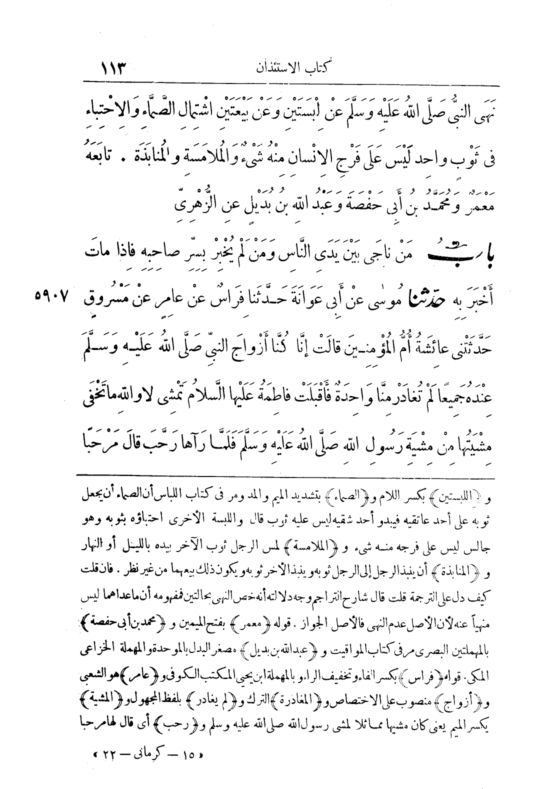 و (اللبستين) بكسر اللام و (الصماء) بتشديد الميم والمد ومر في كتاب اللباس أن الصماء أن يجعل ثوبه على أحد عاتقيه فيبدو أحد شقيه ليس عليه ثوب قال واللبسة الأخرى احتباؤه بثوبه وهو جالس ليس على فرجه منه شيء و (الملامسة) لمس الرجل ثوب الآخر بيده بالليل أو النهار و (المنابذة) أن ينبذ الرجل إلى الرجل ثوبه وينبذ الأخر ثوبه ويكون ذلك بيعهما من غير نظر، فإن قلت كيف دل على الترجمة قلت قال شارح التراجم وجه دلالته أنه خص النهي بحالتين فمفهومه أن ما عداهما ليس منهيًا عنه لأن الأصل عدم النهي فالأصل الجواز، قوله (معمر) بفتح الميمين و (محمد بن أبي حفصة) بالمهملتين البصري مر في كتاب المواقيت و (عبد الله بن بديل) مصغر البدل بالموحدة والمهملة الخزاعي المكي، قوله (فراس) بكسر الفاء وتخفيف الراء والمهملة ابن يحي المكتب الكوفي و (عامر) هو الشعبي و (أزواج) منصوب على الاختصاص و (المغادرة) الترك و (لم يغادر) بلفظ المجهول و (المشية) بكسر الميم يعني كان مشيها مماثلا لمشي رسول الله صلى الله عليه وسلم و (رحب) أي قال لها مرحباً