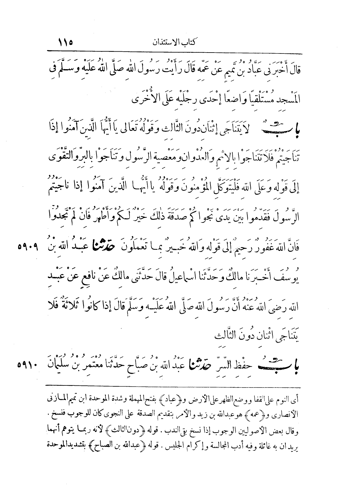 أي النوم على القفا ووضع الظهر على الأرض و (عباد) بفتح المهملة وشدة الموحدة ابن تميم المازني الأنصاري و (عمه) هو عبد الله بن زيد والأمر بتقديم الصدقة على النجوى كان للوجوب فنسخ، وقال بعض الأصوليين الوجوب إذا نسخ بقي الندب، قوله (دون ثالث) لأنه ربما يتوهم أنهما يريد إن به غائلة وفيه أدب المجالسة وإكرام الجليس، قوله (عبد الله بن الصباح) بشديد الموحدة