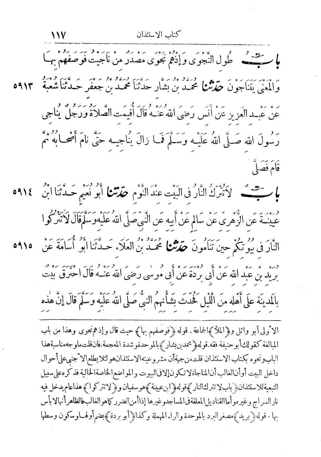 الأولى أبو وائل و (الملأ) الجماعة، قوله (فوصفهم بها) حيث قال وإذ هم نجوى وهذا من باب المبالغة كقولك أبو حنيفة فقه، قوله (محمد بن بشار) بالموحدة وشدة المعجمة، فإن قلت ما وجه مناسبة هذا الباب ونحوه بكتاب الاستئذان قلت من جهة أن مشروعيته الاستئذان هو لئلا يطلع الأجنبي على أحوال داخل البيت أو أن المناجاة لا تكون إلا في البيوت والمواضع الخاصة الخالية فذكره على سبيل التبعية للاستئذان (باب لا تترك النار) قوله (ابن عيينة) هو سفيان و (لا تتركوا) هذا عام يدخل فيه نار السراج وغيره وأما القناديل المعلقة في المساجد وغيرها إذا أمن الضرر كما هو الغالب فالظاهر أنها لا بأس بها، قوله (بريد) مصغر البرد بالموحدة والراء المهملة وكذا (أبو بردة) بضم أولها وسكون وسطها