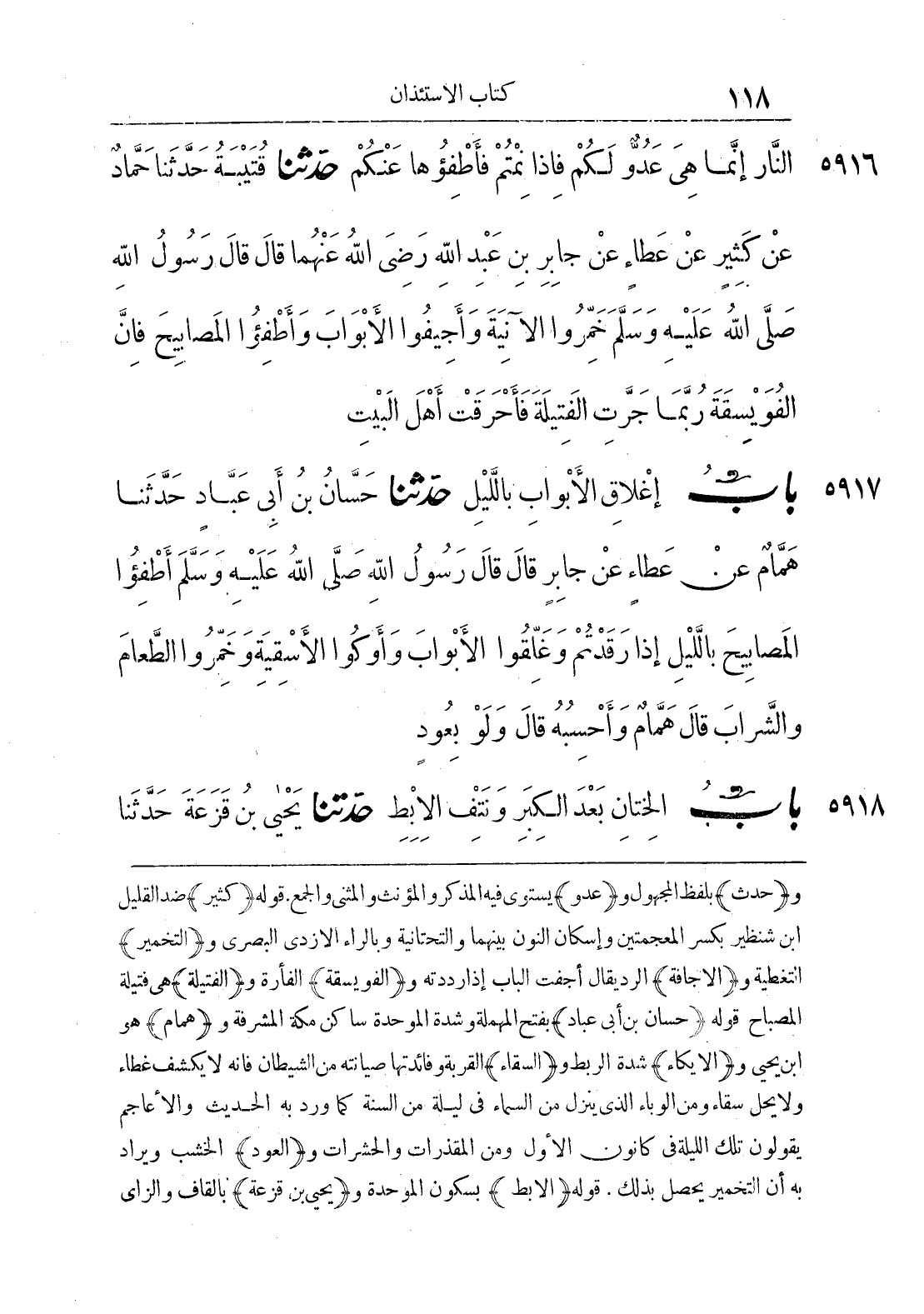 و (حدث) بلفظ المجهول و (عدو) يستوي فيه المذكر والمؤنث والمثنى والجمع، قوله (كثير) ضد القليل ابن شنظير بكسر المعجمتين وإسكان النون بينهما والتحتانية وبالراء الأزدي البصري و (التخمير) التغطية و (الإجافة) الرد يقال أجفت الباب إذا رددته و (الفويسقة) الفأرة و (الفتيلة) هي الفتيلة المصباح قوله (حسان بن أبي عباد) بفتح المهملة وشدة الموحدة ساكن مكة المشرفة و (همام) هو ابن يحي و (الايكاء) شدة الربط و (السقاء) القربة وفائدتها صيانته من الشيطان فإنه لا يكشف غطاء ولا يحل سقاء ومن الوباء الذي ينزل من السماء في ليلة من السنة كما ورد به الحديث والأعاجم يقولون تلك الليلة في كانون الأول ومن المقذرات والحشرات و (العود) الخشب ويراد به أن التخمير يحصل بذلك، قوله (الإبط) بسكون الموحدة و (يحي بن قزعة) بالقاف والزاي