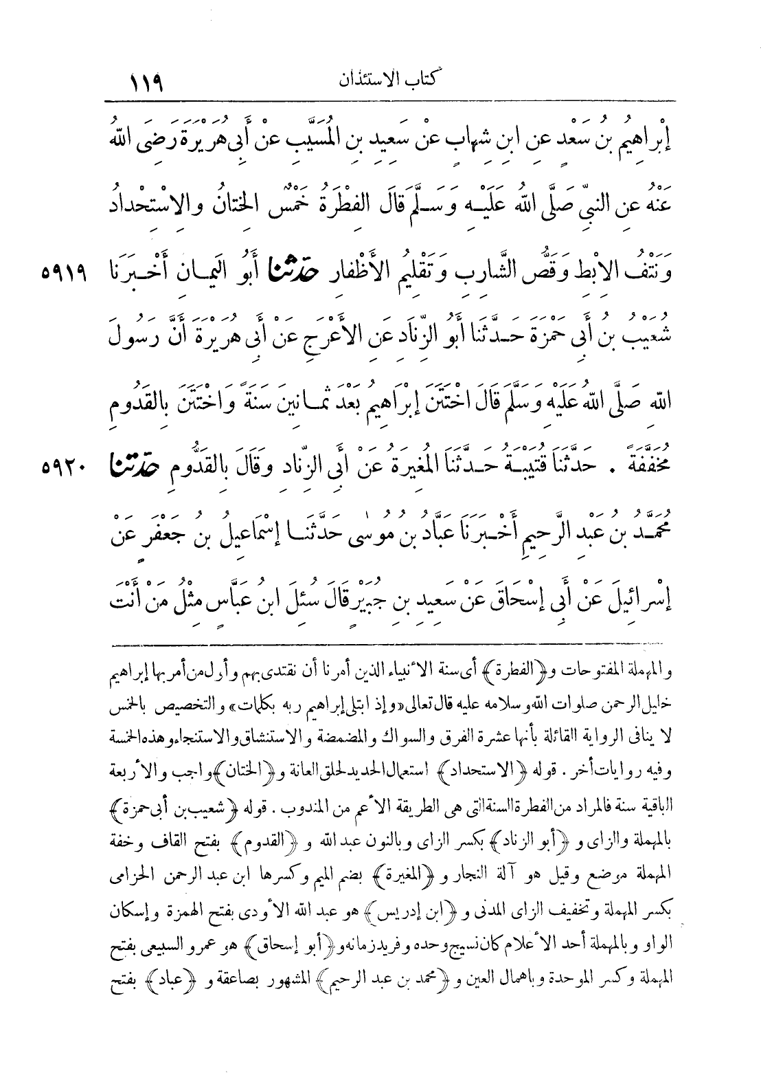 والمهملة المفتوحات و (الفطرة) أي سنة الأنبياء الذين أمرنا أن نفتدي بهم وأول من أمر بها إبراهيم خليل الرحمن صلوات الله وسلامه عليه قال تعالى «وإذا ابتلى إبراهيم ربه بكلمات» والتخصيص بالخمس لا ينافي الرواية القائلة بأنها عشرة الفرق والسواك والمضمضة والاستنشاق والاستنجاء وهذه الخمسة وفيه روايات أخر، قوله (الاستحداد) استعمال الحديد لحلق العانة و (الختان) واجب والأربعة الباقية سنة فالمراد من الفطرة السنة التي هي الطريقة الأعم من المندوب، قوله (شعيب بن أبي حمزة) بالمهملة والزاي و (أبو الزناد) بكسر الزاي وبالنون عبد الله و (القدوم) بفتح القاف وخفة المهملة موضع وقيل هو آلة النجار و (المغيرة) بضم الميم وكسرها ابن عبد الرحمن الحزامي بكسر المهملة وتخفيف الزاي المدني و (ابن إدريس) هو عبد الله الأودي بفتح الهمزة وإسكان الواو وبالمهملة أحد الأعلام كان نسيج وحده وفريد زمانه و (أبو إسحاق) هو عمرو السبيعي بفتح المهملة وكسر الموحدة وبإهمال العين و (محمد بن عبد الرحيم) المشهور بصاعقة و (عباد) بفتح