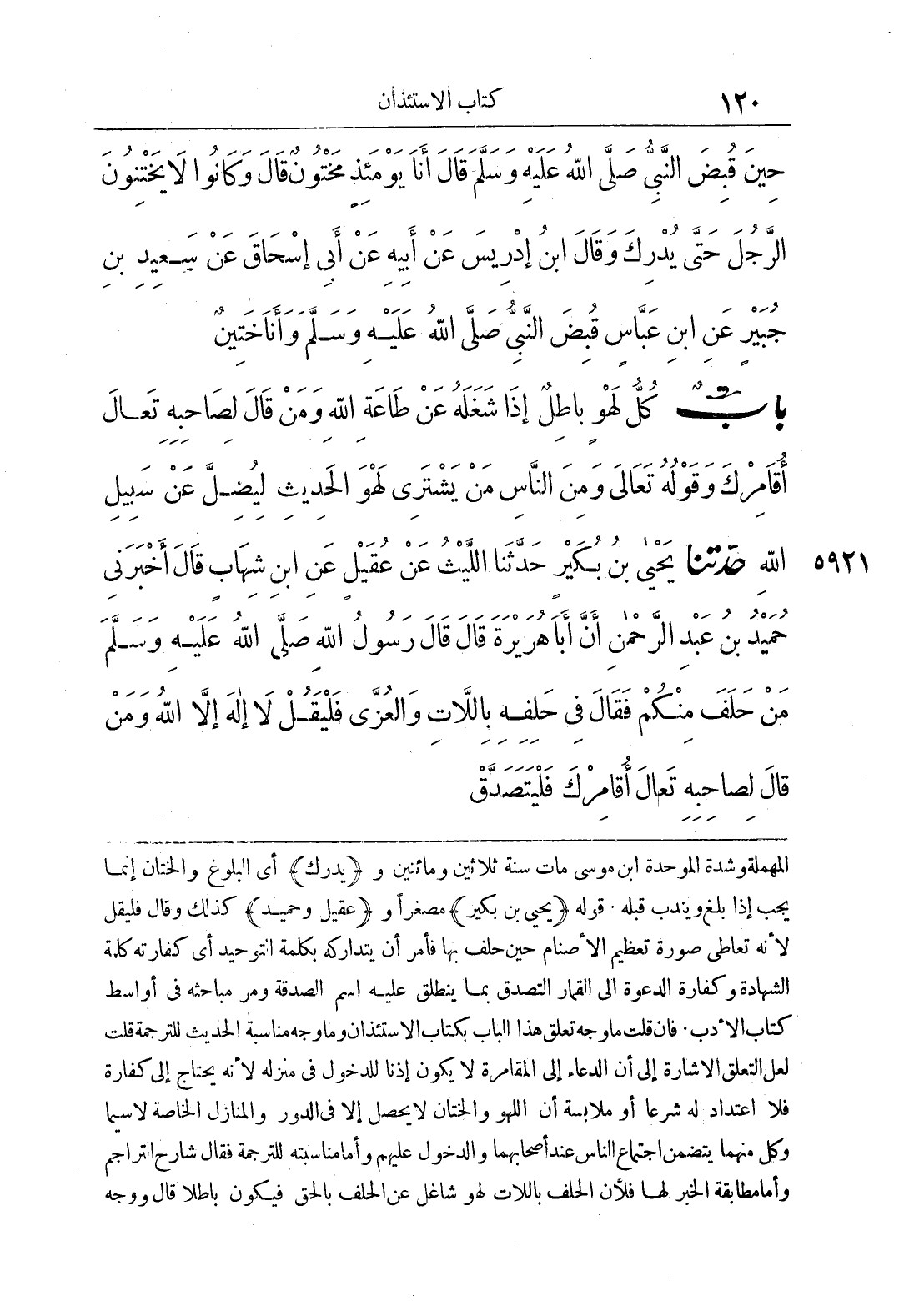 المهملة وشدة الموحدة ابن موسى مات سنة ثلاثين ومائتين و (يدرك) أي البلوغ والختان إنما يجب إذا بلغ ويندب قبله، قوله (يحي بن بكير) مصغرًا و (عقيل وحميد) كذلك وقال فليقل لأنه تعاطى صورة تعظيم الأصنام حين حلف بها فأمر أن يتداركه بكلمة التوحيد أي كفارته كلمة الشهادة وكفارة الدعوة إلى القمار التصدق بما ينطلق عليه اسم الصدقة ومر مباحثه في أواسط كتاب الأدب، فإن قلت ما وجه تعلق بكتاب الاستئذان وما وجه مناسبة الحديث للترجمة قلت لعل التعلق الإشارة إلى أن الدعاء إلى المقامرة لا يكون إذنا للدخول في منزله لأنه يحتاج إلى كفارة فلا اعتداد له شرعا أو ملابسة أن اللهو والختان لا يحصل إلا في الدور والمنازل الخاصة لا سيما وكل منهما يتضمن اجتماع الناس عند أصحابهما والدخول عليهم وأمامنا مناسبته للترجمة فقال شارح التراجم وأما مطابقة الخبر لها فلأن الحلف باللات لهو شغل عن الحلف بالحق فيكون باطلا قال ووجه