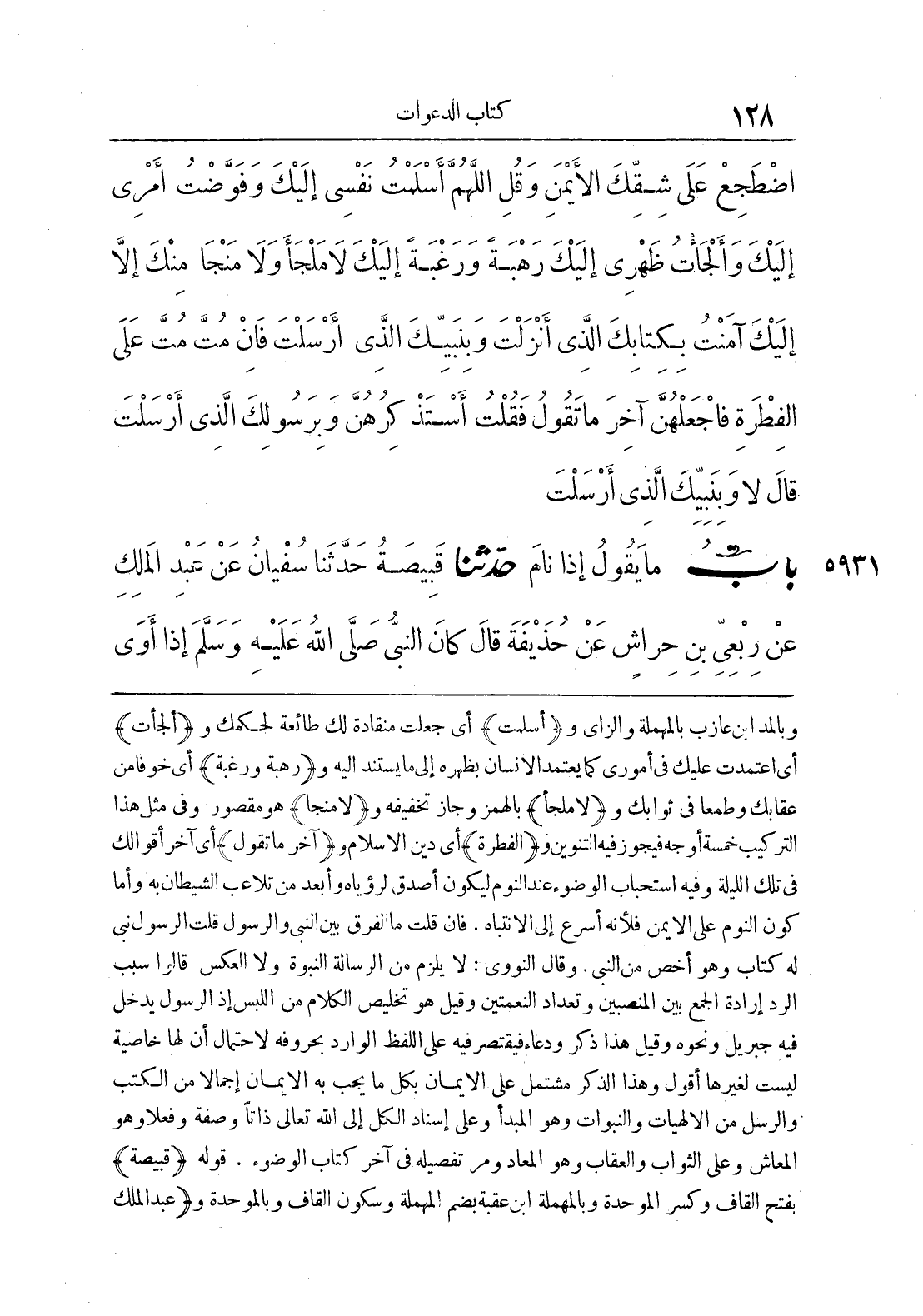 5931 - حَدَّثَنَا قَبِيصَةُ حَدَّثَنَا سُفْيَانُ عَنْ عَبْدِ الْمَلِكِ عَنْ رِبْعِيِّ بْنِ حِرَاشٍ عَنْ حُذَيْفَةَ قَالَ كَانَ النَّبِيُّ صَلَّى اللَّهُ عَلَيْهِ وَسَلَّمَ إِذَا أَوَى