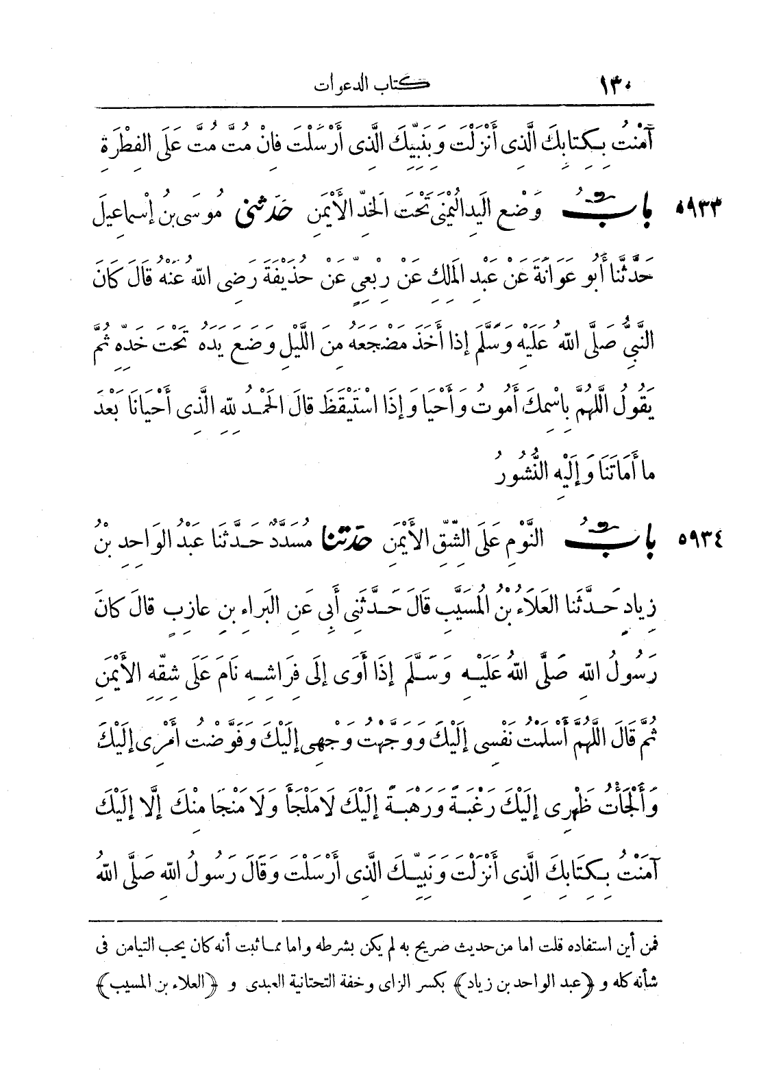 5934 - حَدَّثَنَا مُسَدَّدٌ حَدَّثَنَا عَبْدُ الْوَاحِدِ بْنُ زِيَادٍ حَدَّثَنَا الْعَلَاءُ بْنُ الْمُسَيَّبِ قَالَ حَدَّثَنِي أَبِي عَنْ الْبَرَاءِ بْنِ عَازِبٍ قَالَ كَانَ رَسُولُ اللَّهِ صَلَّى اللَّهُ عَلَيْهِ وَسَلَّمَ إِذَا أَوَى إِلَى فِرَاشِهِ نَامَ عَلَى شِقِّهِ الْأَيْمَنِ ثُمَّ قَالَ اللَّهُمَّ أَسْلَمْتُ نَفْسِي إِلَيْكَ وَوَجَّهْتُ وَجْهِي إِلَيْكَ وَفَوَّضْتُ أَمْرِي إِلَيْكَ وَأَلْجَاتُ ظَهْرِي إِلَيْكَ رَغْبَةً وَرَهْبَةً إِلَيْكَ لَا مَلْجَأَ وَلَا مَنْجَا مِنْكَ إِلَّا إِلَيْكَ آمَنْتُ بِكِتَابِكَ الَّذِي أَنْزَلْتَ وَبِنَبِيِّكَ الَّذِي أَرْسَلْتَ وَقَالَ رَسُولُ اللَّهِ صَلَّى اللَّهُ