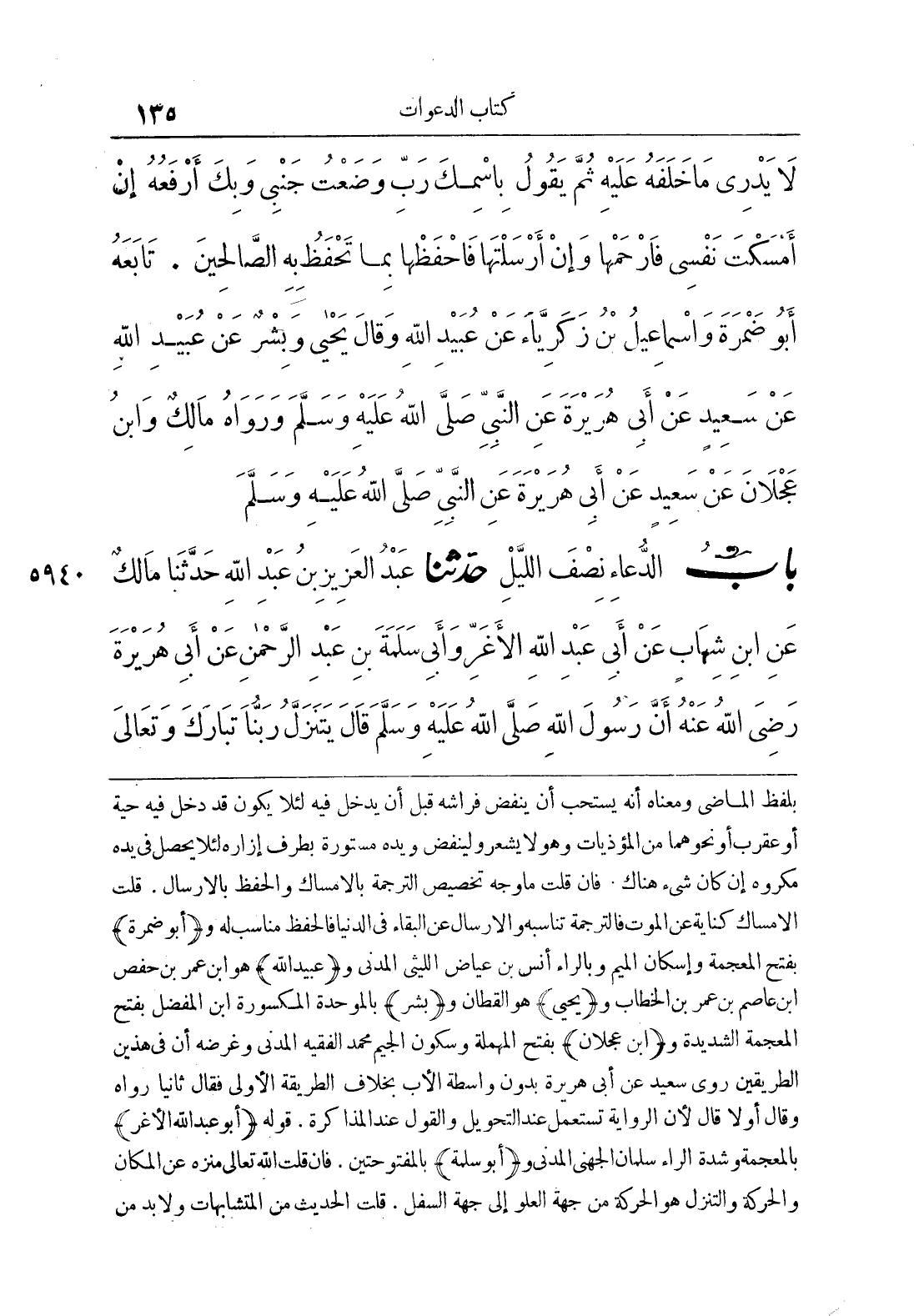 5940 - حَدَّثَنَا عَبْدُ الْعَزِيزِ بْنُ عَبْدِ اللَّهِ حَدَّثَنَا مَالِكٌ عَنْ ابْنِ شِهَابٍ عَنْ أَبِي عَبْدِ اللَّهِ الْأَغَرِّ وَأَبِي سَلَمَةَ بْنِ عَبْدِ الرَّحْمَنِ عَنْ أَبِي هُرَيْرَةَ رَضِيَ اللَّهُ عَنْهُ أَنَّ رَسُولَ اللَّهِ صَلَّى اللَّهُ عَلَيْهِ وَسَلَّمَ قَالَ يَتَنَزَّلُ رَبُّنَا تَبَارَكَ وَتَعَالَى