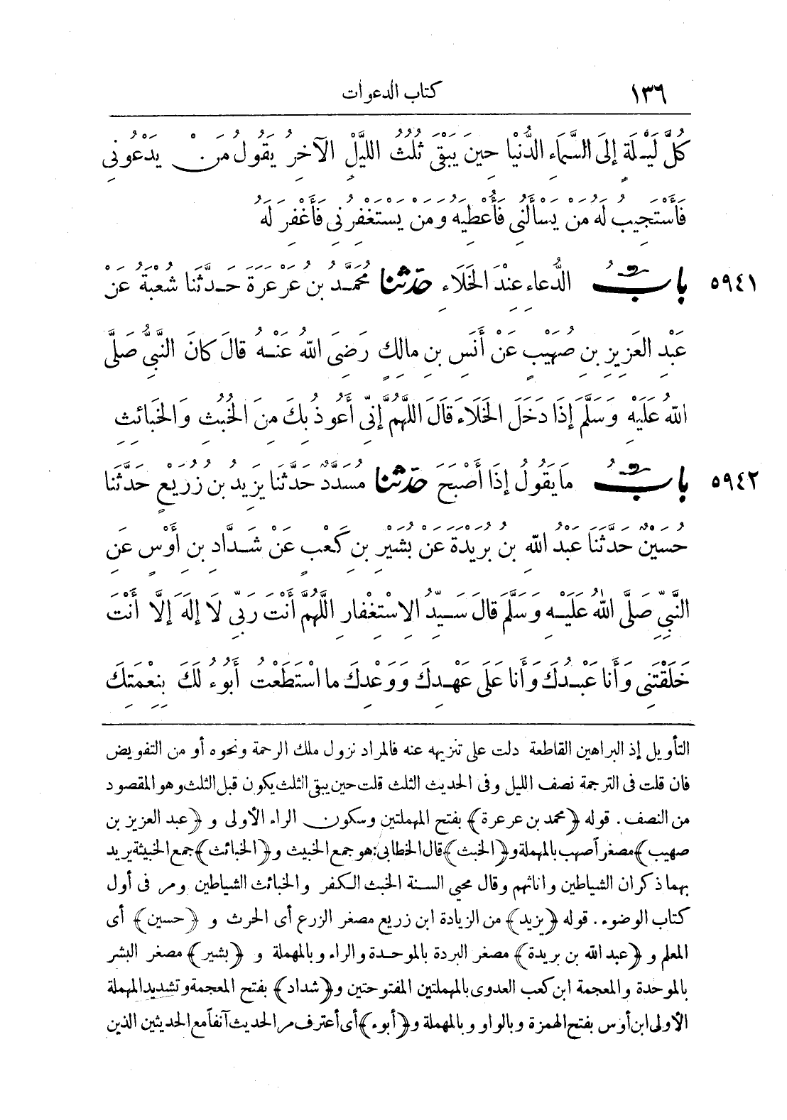 التأويل إذ البراهين القاطعة دلت على تنزيهه عنه فالمراد نزول ملك الرحمة ونحوه أو من التفويض فإن قلت في الترجمة نصف الليل وفي الحديث الثلث قلت حين يبقى الثلث يكون قبل الثلث وهو المقصود من النصف، قوله (محمد بن عرعرة) بفتح المهملتين وسكون الراء الأولى و (عبد العزيز بن صهيب) مصغرًا صهب بالمهملة و (الخبث) قال الخطابي: هو جمع الخبيث و (الخبائث) جمع الخبيثة يريد بهما ذكران الشياطين وإناثهم وقال محي السنة الخبث الكفر والخبائث الشياطين ومر في أول كتاب الوضوء، قوله (يزيد) من الزيادة ابن زريع مصغر الزرع أي الحرث و (حسين) أي المعلم و (عبد الله بن بريدة) مصغر البردة بالموحدة والراء وبالمهملة و (بشير) مصغر البشر بالموحدة والمعجمة ابن كعب العدوي بالمهملتين المفتوحتين و (شداد) بفتح المعجمة وتشديد المهملة الأولى ابن أوس بفتح الهمزة وبالواو وبالمهملة و (أبوء) أي أعترف مر الحديث آنفًا مع الحديثين الذين