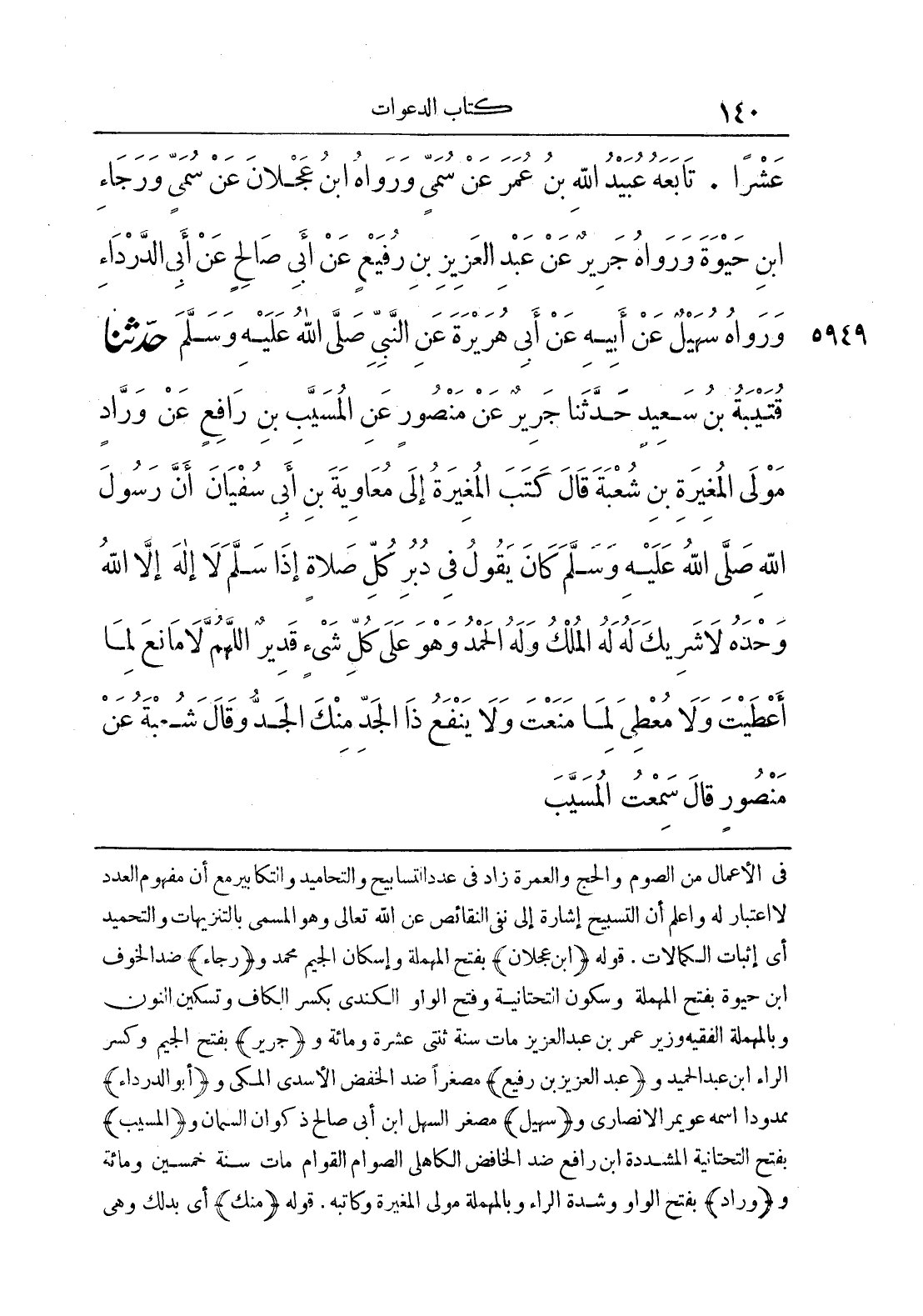 5949 - حَدَّثَنَا قُتَيْبَةُ بْنُ سَعِيدٍ حَدَّثَنَا جَرِيرٌ عَنْ مَنْصُورٍ عَنْ الْمُسَيَّبِ بْنِ رَافِعٍ عَنْ وَرَّادٍ مَوْلَى الْمُغِيرَةِ بْنِ شُعْبَةَ قَالَ كَتَبَ الْمُغِيرَةُ إِلَى مُعَاوِيَةَ بْنِ أَبِي سُفْيَانَ أَنَّ رَسُولَ اللَّهِ صَلَّى اللَّهُ عَلَيْهِ وَسَلَّمَ كَانَ يَقُولُ فِي دُبُرِ كُلِّ صَلَاةٍ إِذَا سَلَّمَ لَا إِلَهَ إِلَّا اللَّهُ وَحْدَهُ لَا شَرِيكَ لَهُ لَهُ الْمُلْكُ وَلَهُ الْحَمْدُ وَهُوَ عَلَى كُلِّ شَيْءٍ قَدِيرٌ اللَّهُمَّ لَا مَانِعَ لِمَا أَعْطَيْتَ وَلَا مُعْطِيَ لِمَا مَنَعْتَ وَلَا يَنْفَعُ ذَا الْجَدِّ مِنْكَ الْجَدُّ وَقَالَ شُعْبَةُ عَنْ مَنْصُورٍ قَالَ سَمِعْتُ الْمُسَيَّبَ