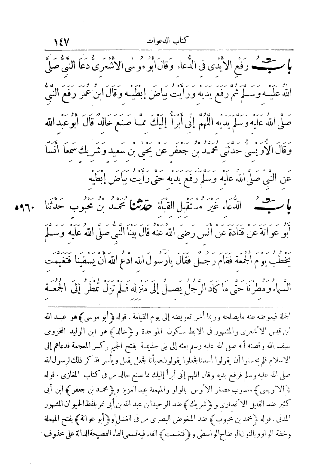 الجملة فيعوضه عنه ما يصلحه وربما أخر تعويضه إلى يوم القيامة، قوله (أبو موسى) هو عبد الله ابن قيس الأشعري والمشهور في الإبط سكون الموحدة و (خالد) هو ابن الوليد المخزومي سيف الله وقصته أنه صلى الله عليه وسلم بعثه إلى بني جذيمة بفتح الجيم وكسر المعجمة فدعاهم إلى الإسلام فلم يحسنوا أن يقولوا أسلمنا فجعلوا يقولون صبأنا فجعل يقتل ويأسر فذكر ذلك لرسول الله صلى الله عليه وسلم فرفع يديه وقال اللهم إني أبرأ مما صنع خالد مر في كتاب المغازي، قوله (الأويسي) منسوب مصغر الأوس بالواو وبالمهملة عبد العزيز و (محمد بن جعفر) ابن أبي كثير ضد القليل الأنصاري و (شريك) ضد الوحيد ابن عبد الله بن أبي نمر بلفظ الحيوان المشهور المدني، قوله (محمد بن محبوب) ضد المبغوض البصري مر في الغسل و (أبو عوانة) بفتح المهملة وخفة الواو وبالنون الوضاح الواسطي و (فتغيمت) الفاء فيه تسمى الفاء الفصيحة الدالة على محذوف