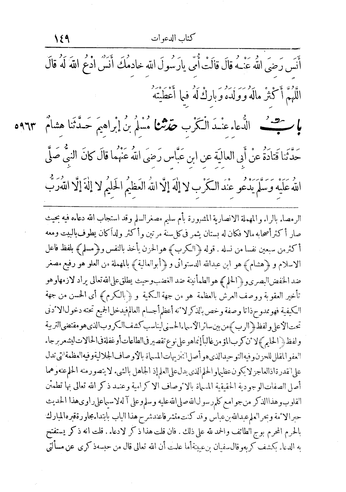 5963 - حَدَّثَنَا مُسْلِمُ بْنُ إِبْرَاهِيمَ حَدَّثَنَا هِشَامٌ حَدَّثَنَا قَتَادَةُ عَنْ أَبِي الْعَالِيَةِ عَنْ ابْنِ عَبَّاسٍ رَضِيَ اللَّهُ عَنْهُمَا قَالَ كَانَ النَّبِيُّ صَلَّى اللَّهُ عَلَيْهِ وَسَلَّمَ يَدْعُو عِنْدَ الْكَرْبِ يَقُولُ لَا إِلَهَ إِلَّا اللَّهُ الْعَظِيمُ الْحَلِيمُ لَا إِلَهَ إِلَّا اللَّهُ رَبُّ