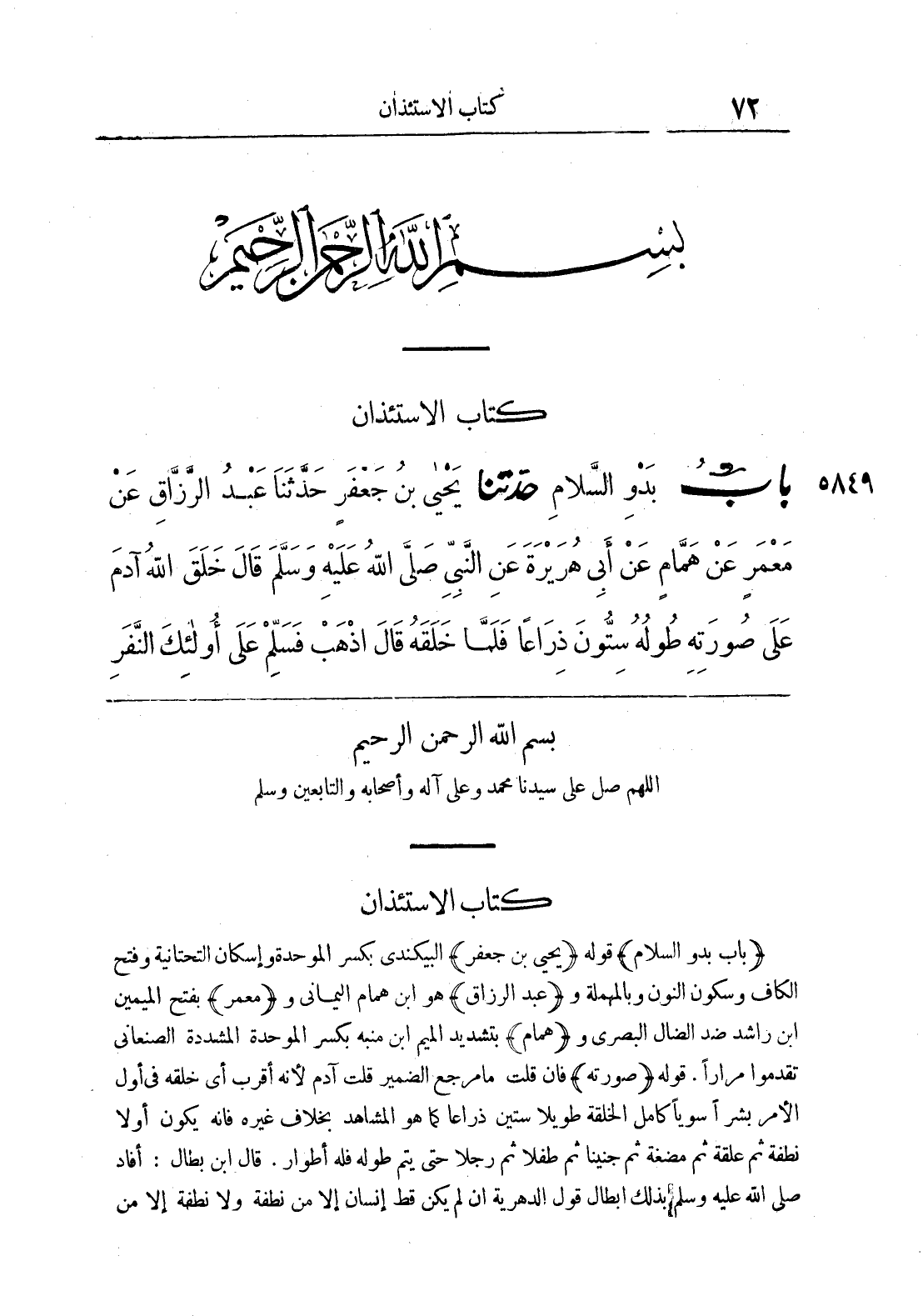 5849 - حَدَّثَنَا يَحْيَى بْنُ جَعْفَرٍ حَدَّثَنَا عَبْدُ الرَّزَّاقِ عَنْ مَعْمَرٍ عَنْ هَمَّامٍ عَنْ أَبِي هُرَيْرَةَ عَنْ النَّبِيِّ صَلَّى اللَّهُ عَلَيْهِ وَسَلَّمَ قَالَ خَلَقَ اللَّهُ آدَمَ عَلَى صُورَتِهِ طُولُهُ سِتُّونَ ذِرَاعًا فَلَمَّا خَلَقَهُ قَالَ اذْهَبْ فَسَلِّمْ عَلَى أُولَئِكَ النَّفَرِ