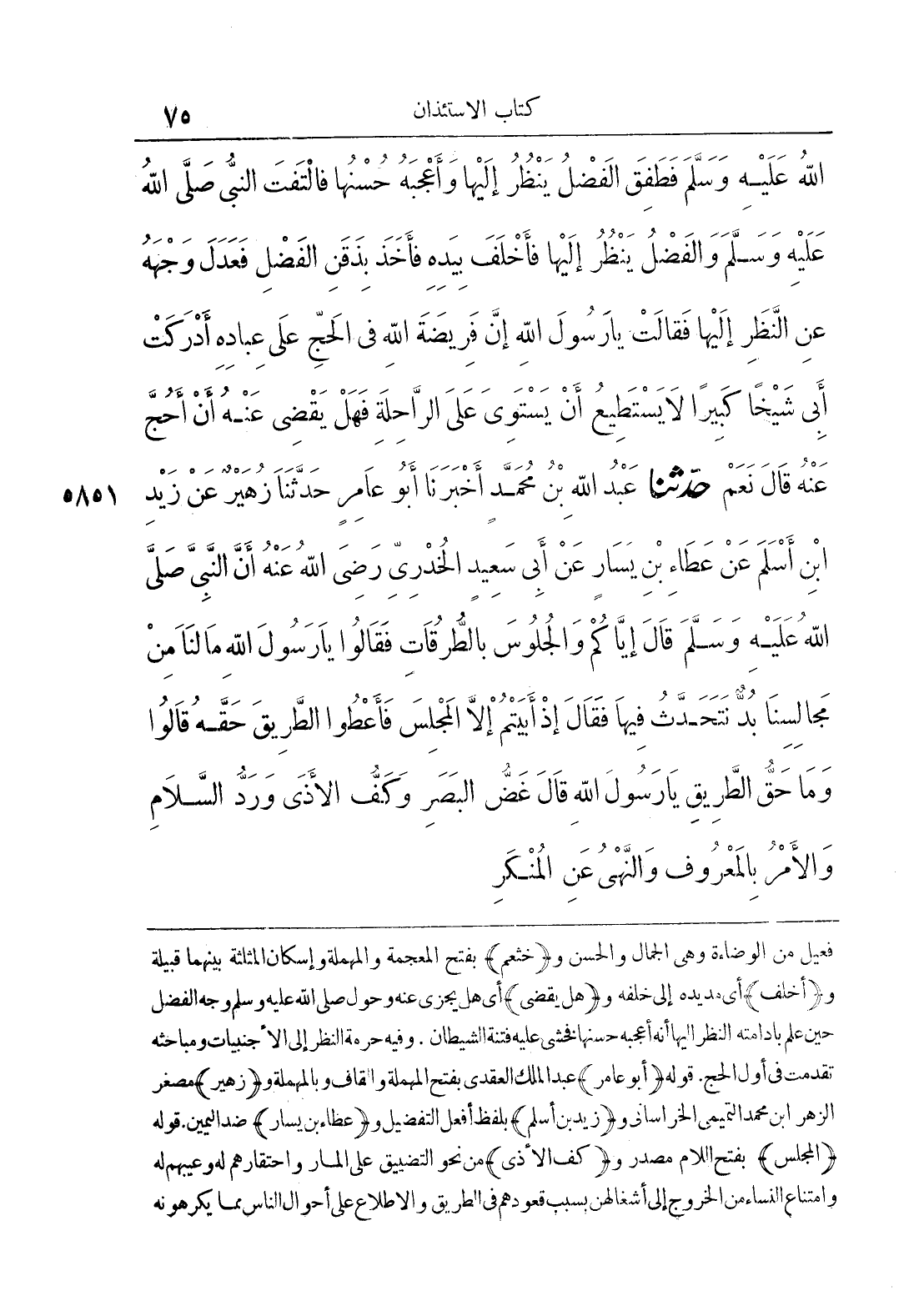 5851 - حَدَّثَنَا عَبْدُ اللَّهِ بْنُ مُحَمَّدٍ أَخْبَرَنَا أَبُو عَامِرٍ حَدَّثَنَا زُهَيْرٌ عَنْ زَيْدِ بْنِ أَسْلَمَ عَنْ عَطَاءِ بْنِ يَسَارٍ عَنْ أَبِي سَعِيدٍ الْخُدْرِيِّ رَضِيَ اللَّهُ عَنْهُ أَنَّ النَّبِيَّ صَلَّى اللَّهُ عَلَيْهِ وَسَلَّمَ قَالَ إِيَّاكُمْ وَالْجُلُوسَ بِالطُّرُقَاتِ فَقَالُوا يَا رَسُولَ اللَّهِ مَا لَنَا مِنْ مَجَالِسِنَا بُدٌّ نَتَحَدَّثُ فِيهَا فَقَالَ إِذْ أَبَيْتُمْ إِلَّا الْمَجْلِسَ فَأَعْطُوا الطَّرِيقَ حَقَّهُ قَالُوا وَمَا حَقُّ الطَّرِيقِ يَا رَسُولَ اللَّهِ قَالَ غَضُّ الْبَصَرِ وَكَفُّ الْأَذَى وَرَدُّ السَّلَامِ وَالْأَمْرُ بِالْمَعْرُوفِ وَالنَّهْيُ عَنْ الْمُنْكَرِ